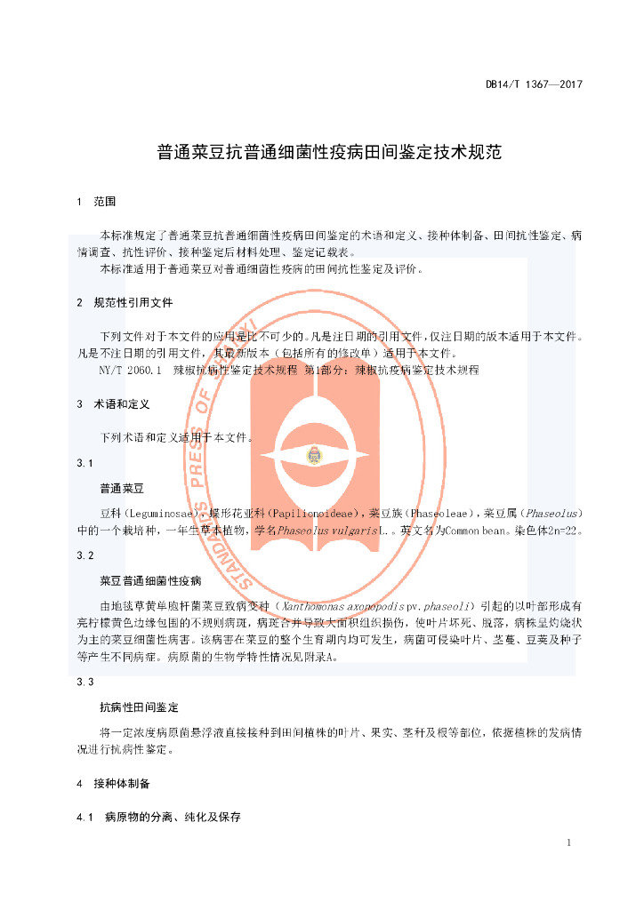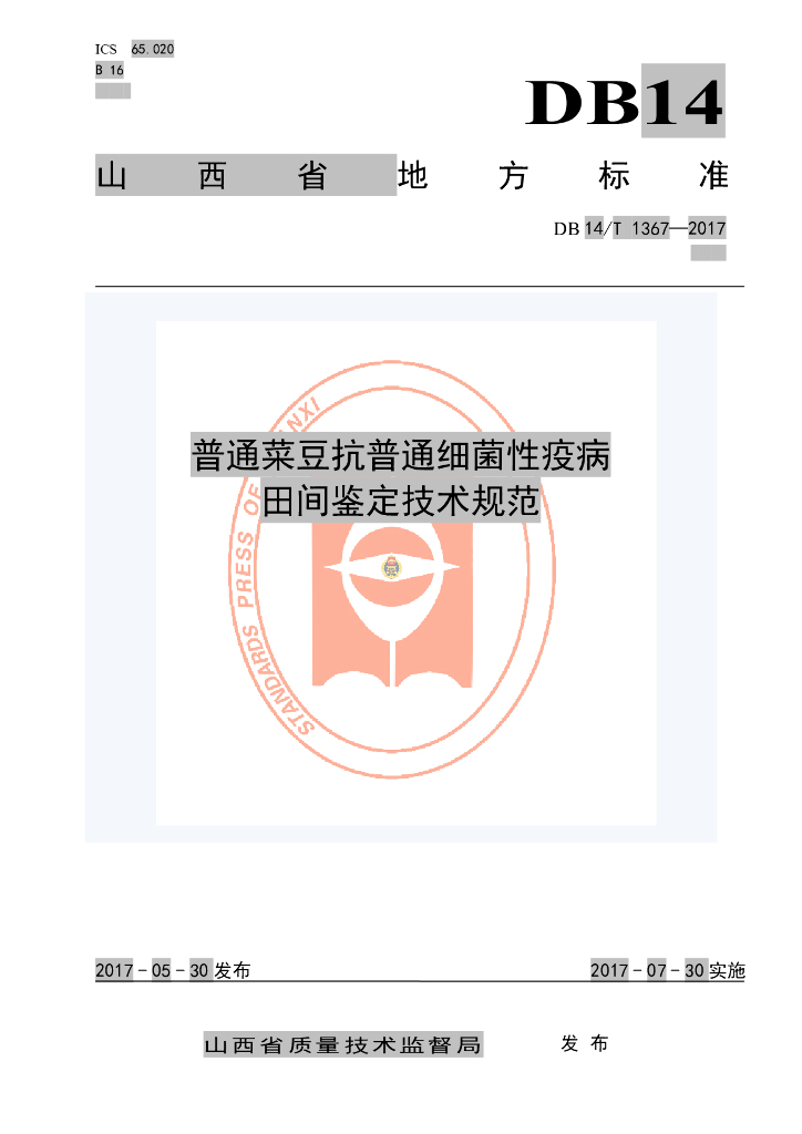 DB14/T 1367-2017 普通菜豆抗普通细菌性疫病田间鉴定技术规范