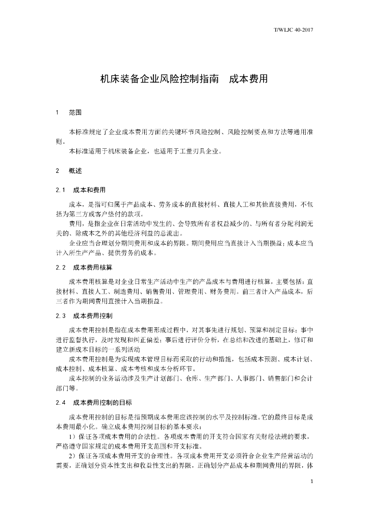 T/WLJC 40-2017 机床装备企业风险控制指南 成本费用
