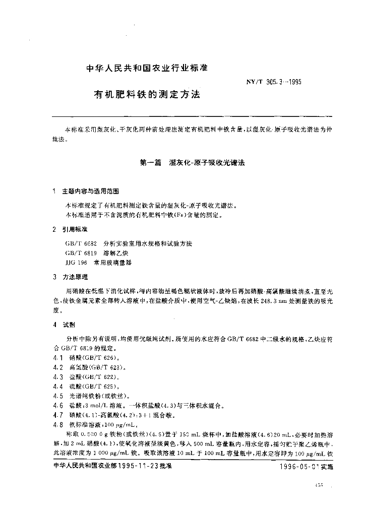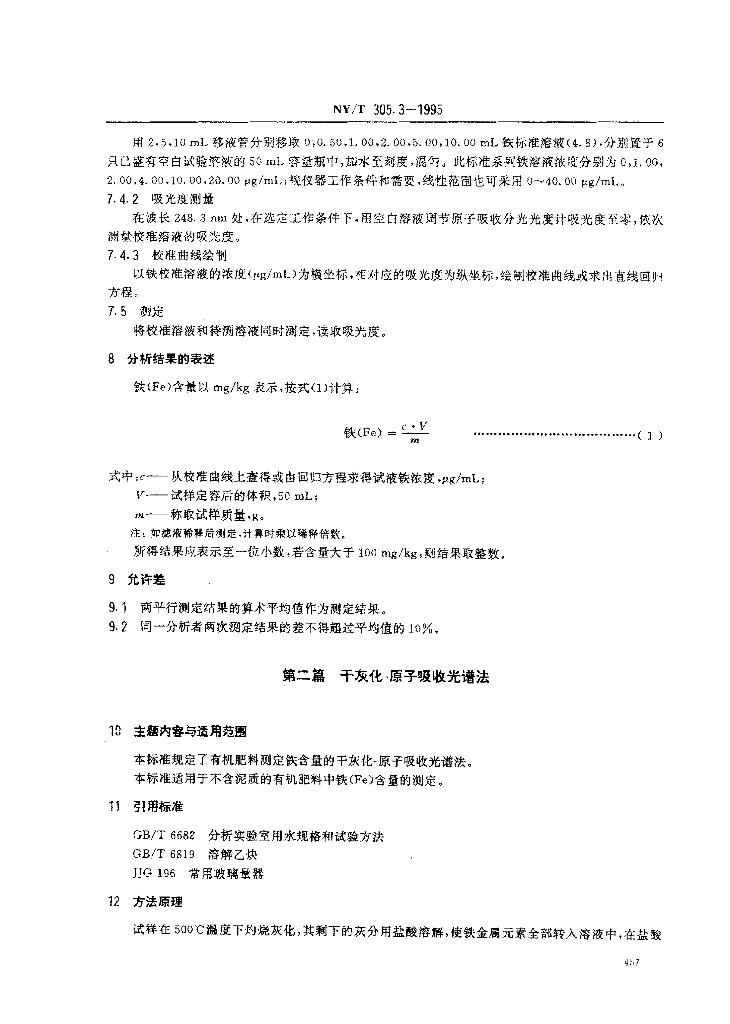 NY/T 305.3-1995 有机肥料铁的测定方法