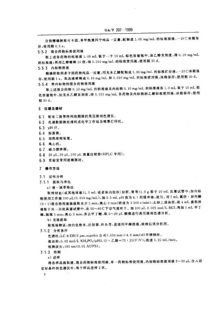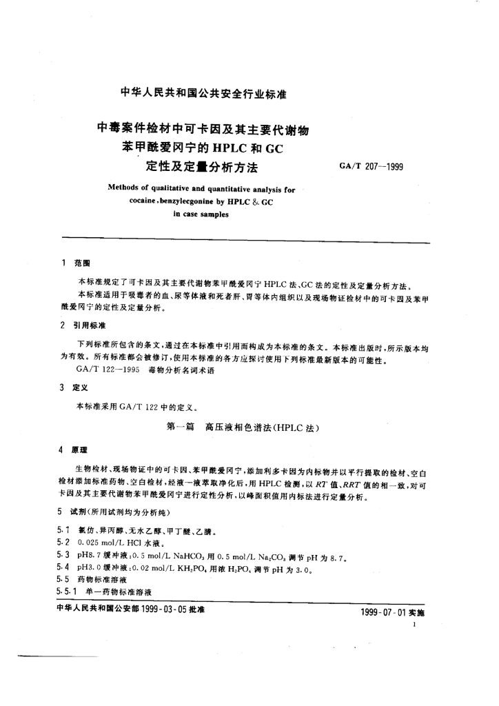 GA/T 207-1999 中毒案件检材中可卡因及其主要代谢物苯甲酰爱冈宁的HPLC和GC定性及定量分析方法