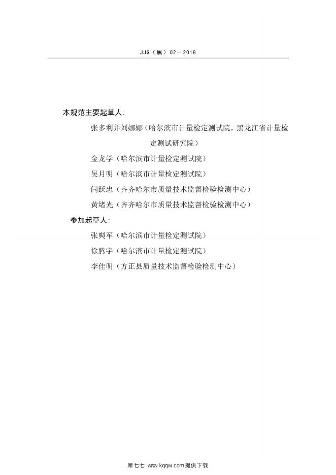 张多利并刘娜娜(哈尔滨市计量检定测试院,黑龙江省计量检定测试研究院)、金龙学(哈尔滨市计量检定测试院)、吴月明(哈尔滨市计量检定测试院)、闫跃忠(齐齐哈尔市质量技术监督检验检测中心)、黄绪光(齐齐哈尔市质量技术监督检验检测中心)、张奭军(哈尔滨市计量检定测试院)、徐腾宇(哈尔滨市计量检定测试院)、李佳明(方正县质量技术监督检验检测中心)