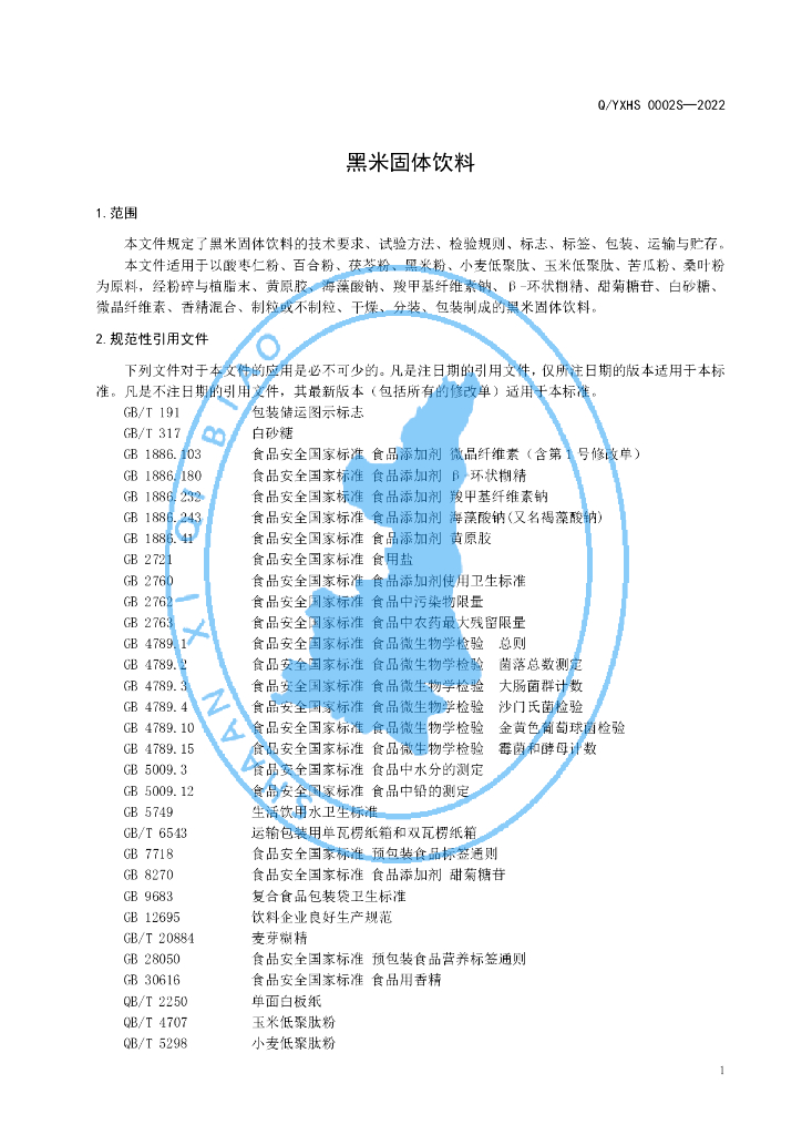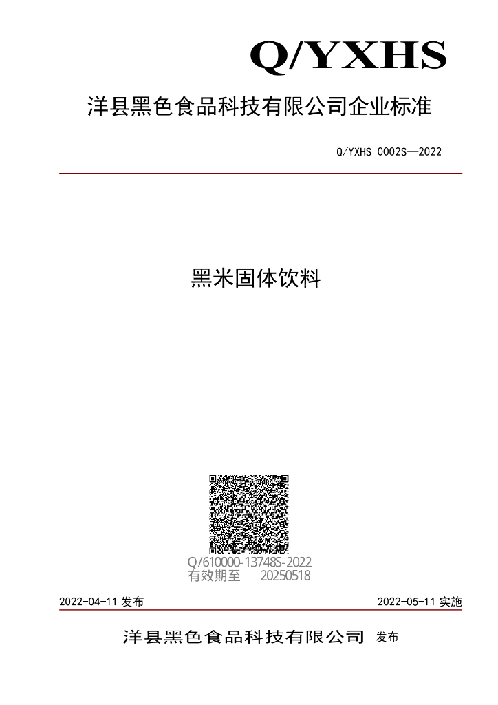 Q/YXHS 0002S-2022 黑米固体饮料