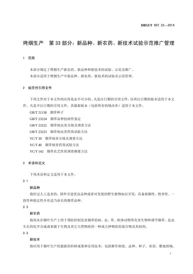 DB53/T 607.33-2014 烤烟生产 第33部分:新品种、新农药、新技术试验示范推广管理