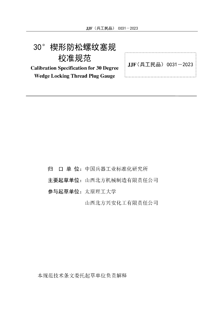 JJF(兵工民品)0031-2023 30°楔形防松螺纹塞规校准规范(报批稿)