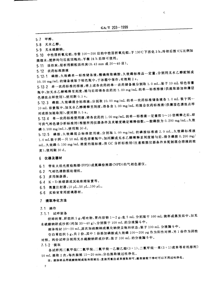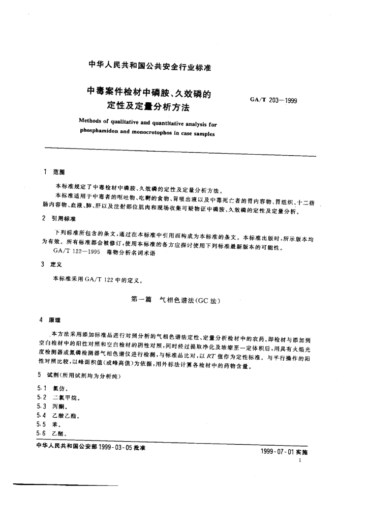 GA/T 203-1999 中毒案件检材中磷胺、久效磷的定性及定量分析方法