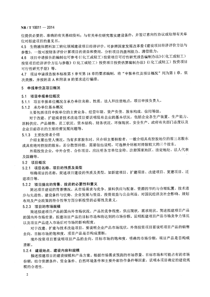 NB/T 10011-2014 生物液体燃料加工转化领域项目申请报告编制内容深度规定