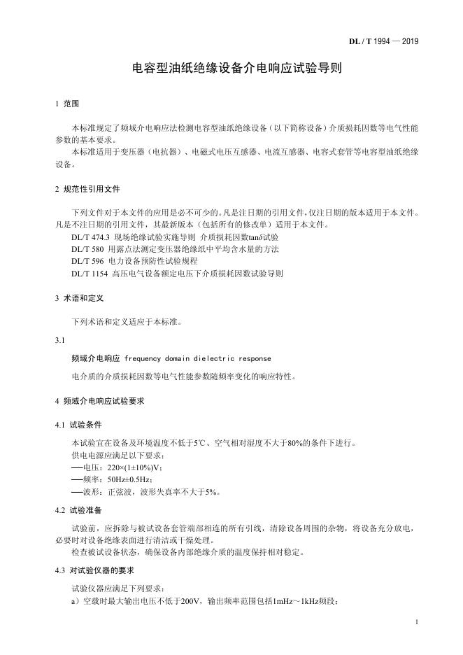 DL/T 1994-2019 电容型油纸绝缘设备介电响应试验导则