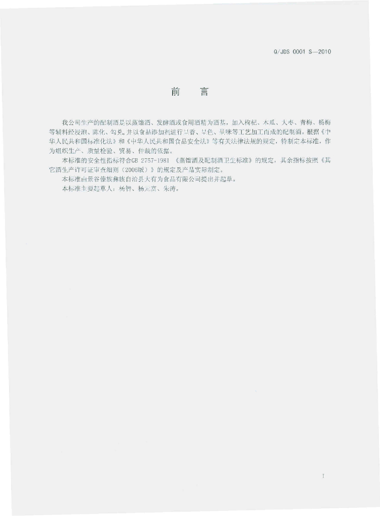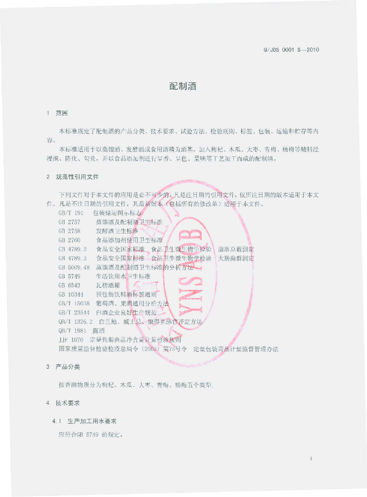 Q/JDS 0001S-2010 配制酒