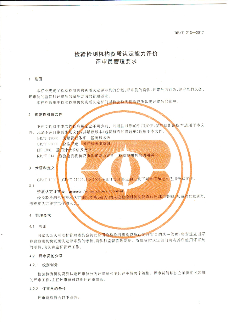 RB/T 213-2017 检验检测机构资质认定能力评价 评审员管理要求