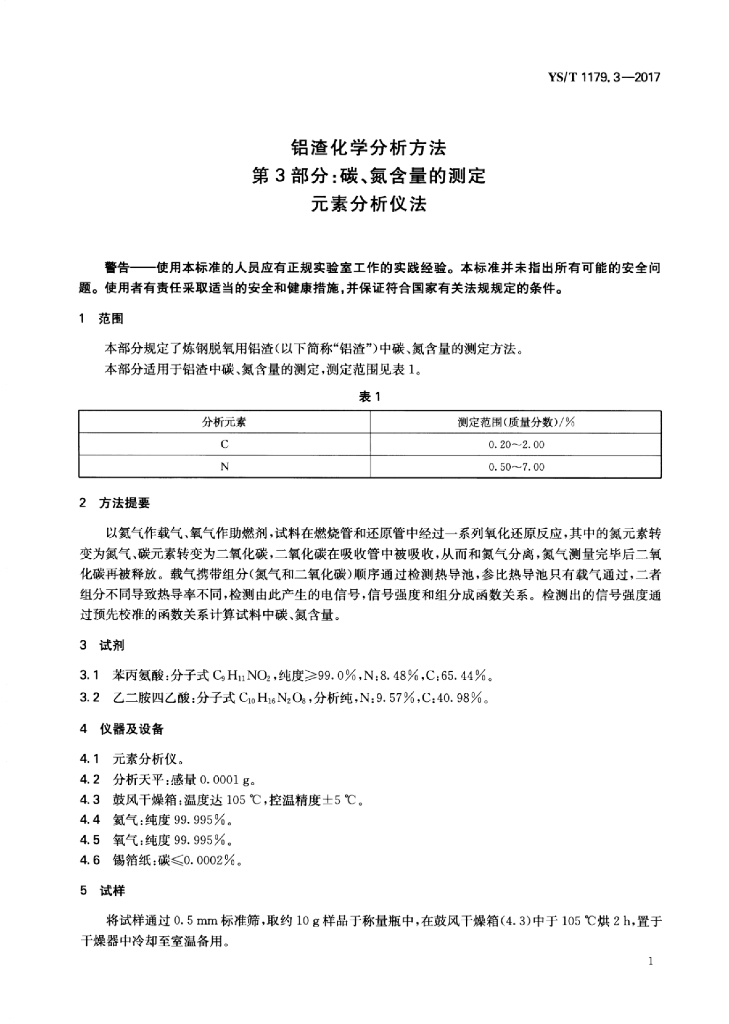 YS/T 1179.3-2017 铝渣化学分析方法 第3部分:碳、氮含量的测定元素分析仪法