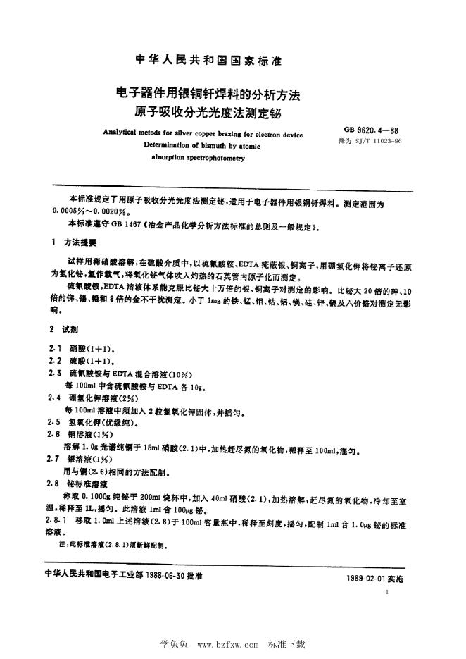 SJ/T 11023-1996 电子器件用银铜钎焊料的分析方法 原子吸收分光光度法测定铋