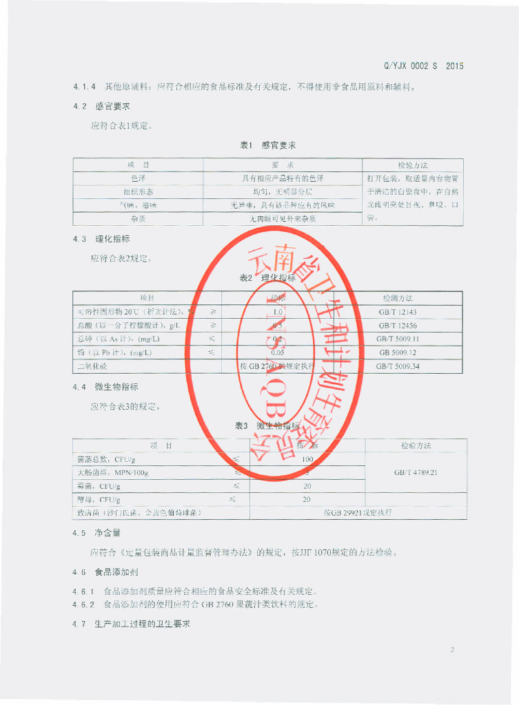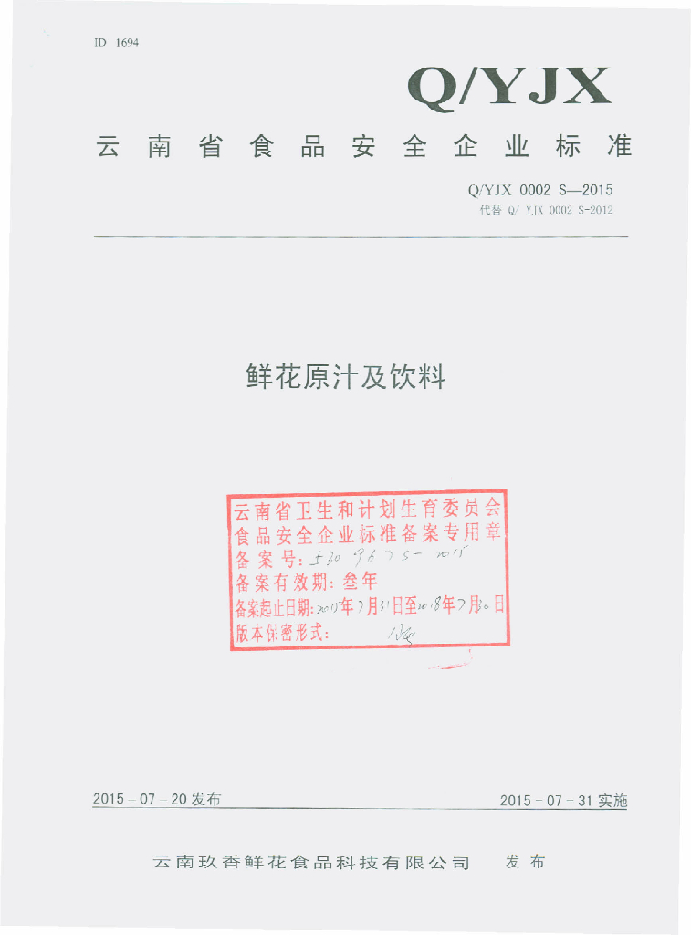 Q/YJX 0002S-2015 云南玖香鲜花食品科技有限公司 鲜花原汁及饮料