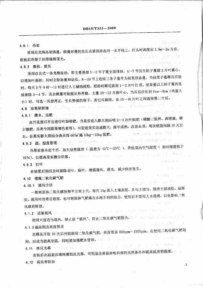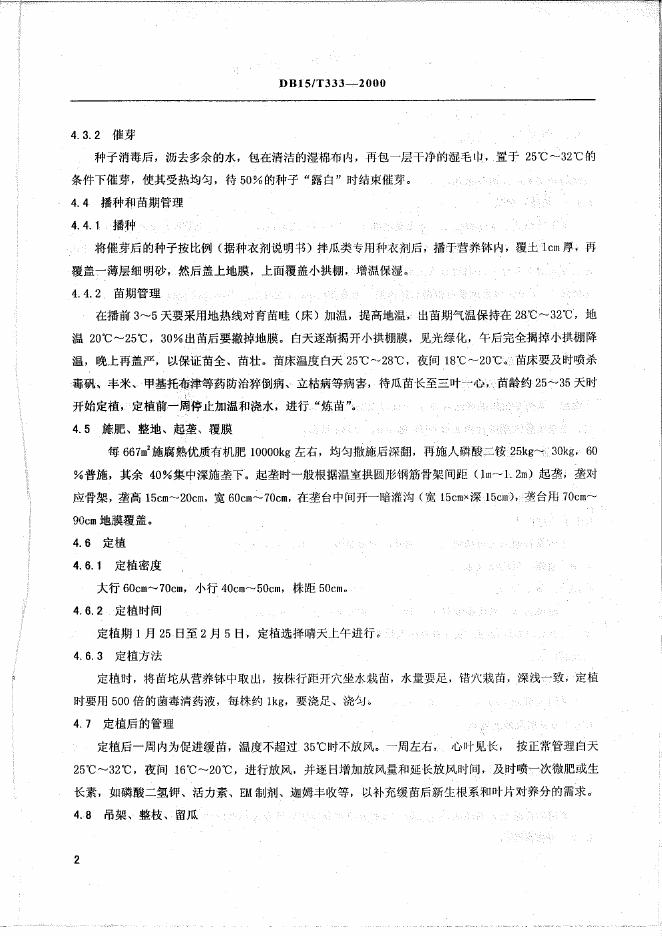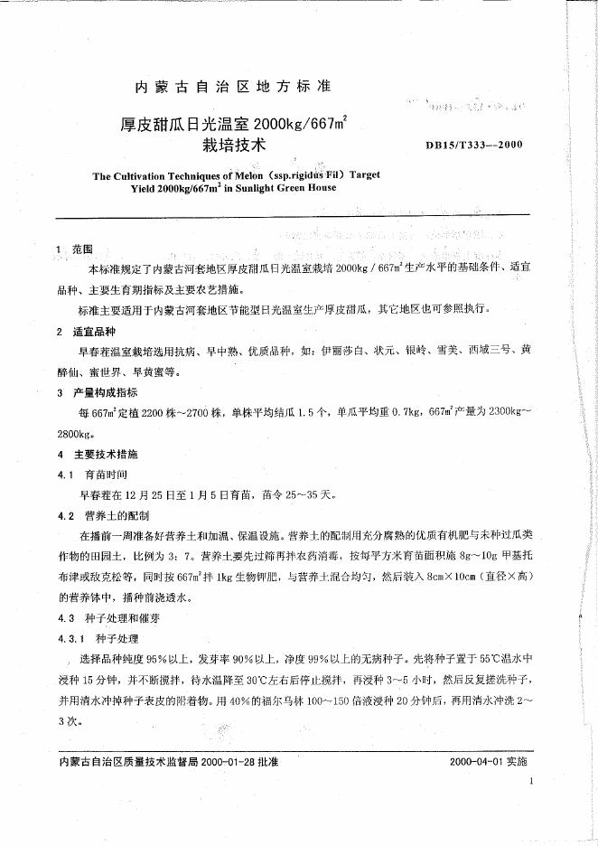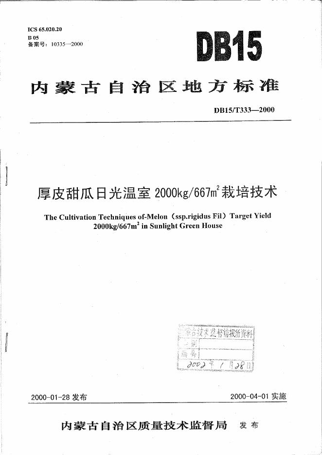 DB15/T 333-2000 厚皮甜瓜日光温室2000kg/667m2栽培技术