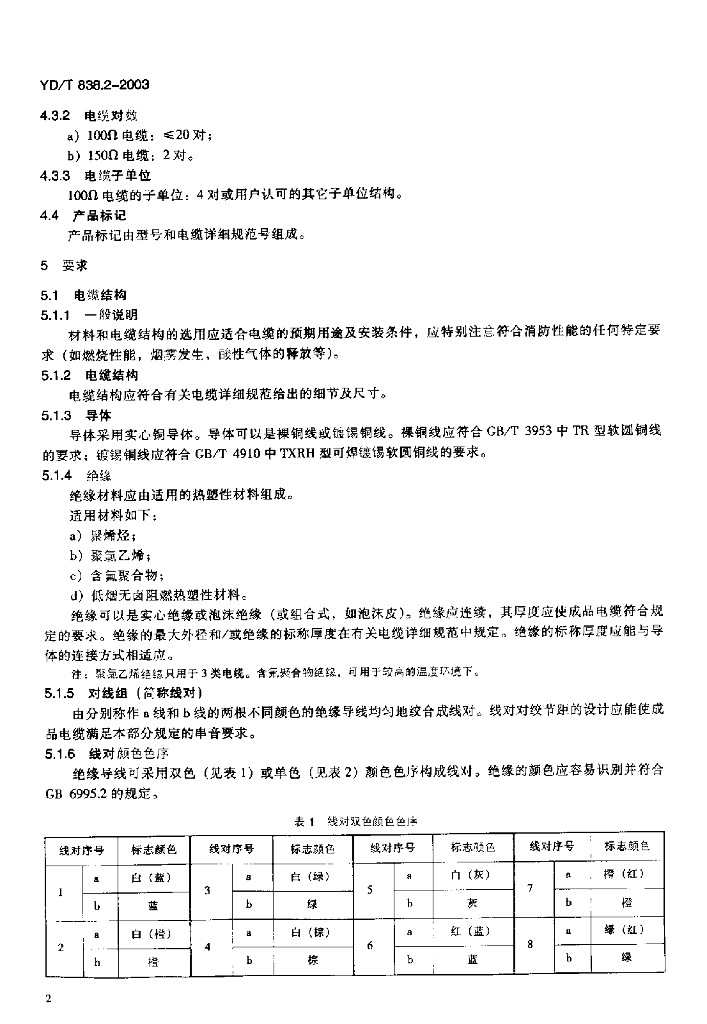 YD/T 838.2-2003 数字通信用对绞/星绞对称电缆 第二部分:水平对绞电缆