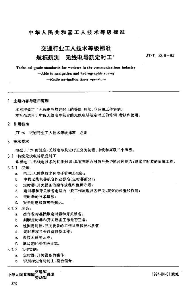 JT/T 32.8-1993 交通行业工人技术等级标准航标航测无线电导航定时工