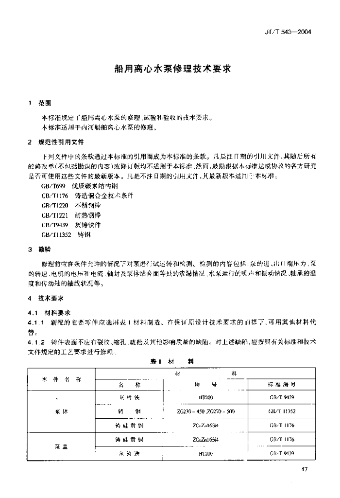 JT/T 543-2004 船用离心水泵修理技术要求