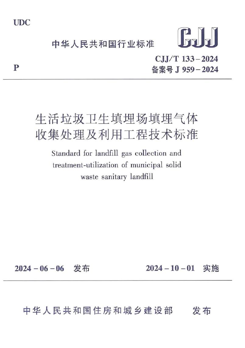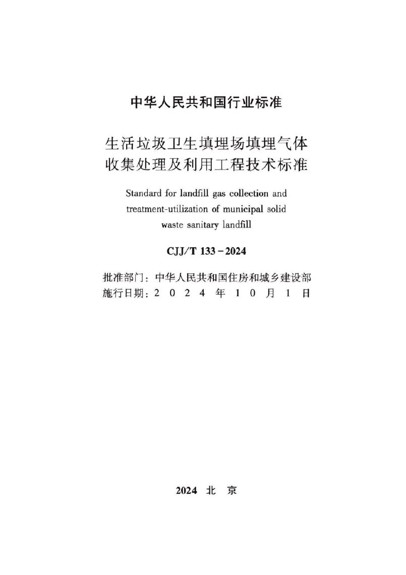 CJJ/T 133-2024 生活垃圾卫生填埋场填埋气体收集处理及利用工程技术标准(附条文说明)