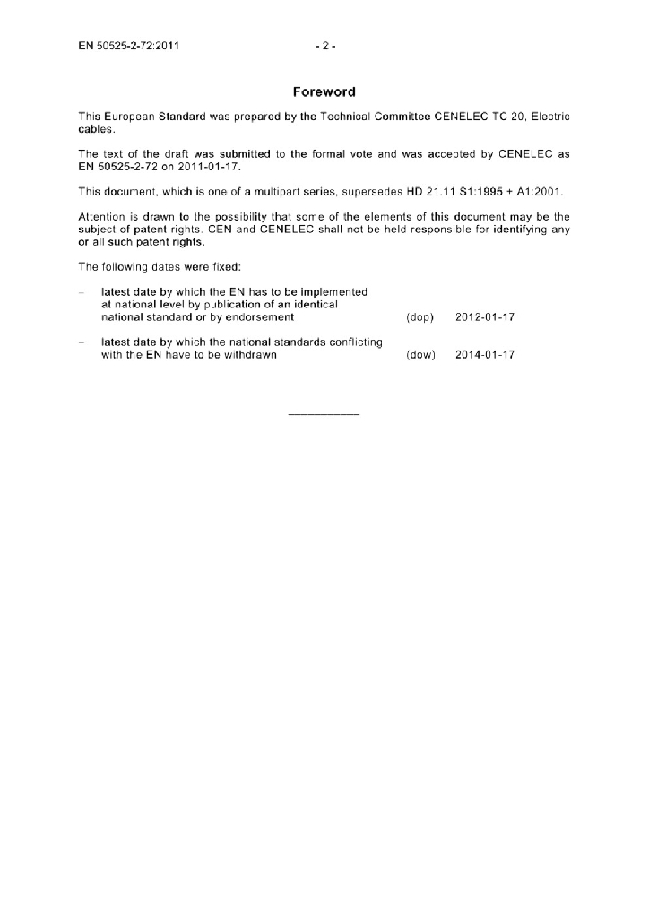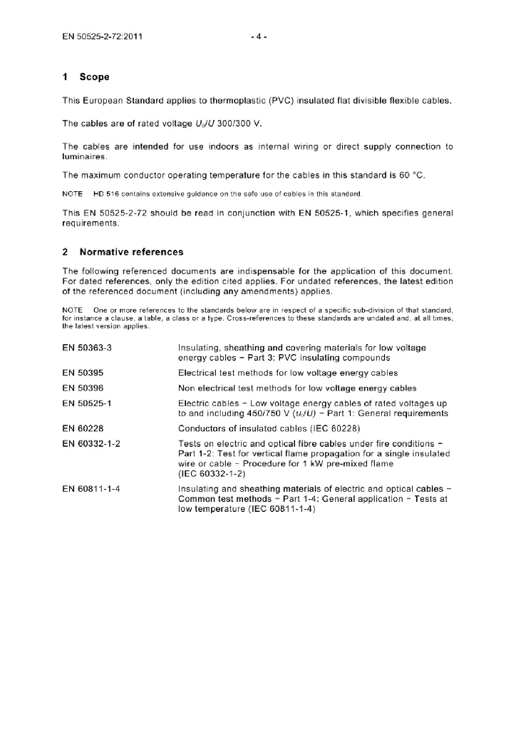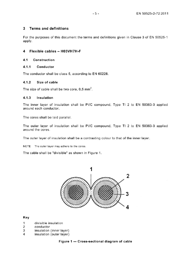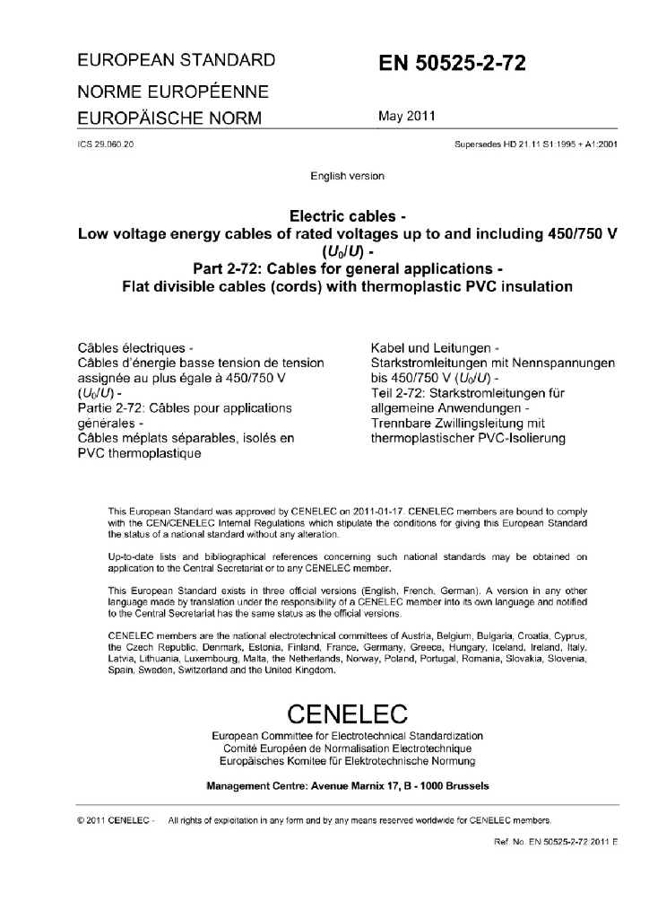 EN 50525-2-72:2011 额定电压450/750V及以下低压节能电缆 - 第2-72部分 通用电缆 - 带有热塑性聚氯乙烯绝缘的扁平可分割电缆(软线)