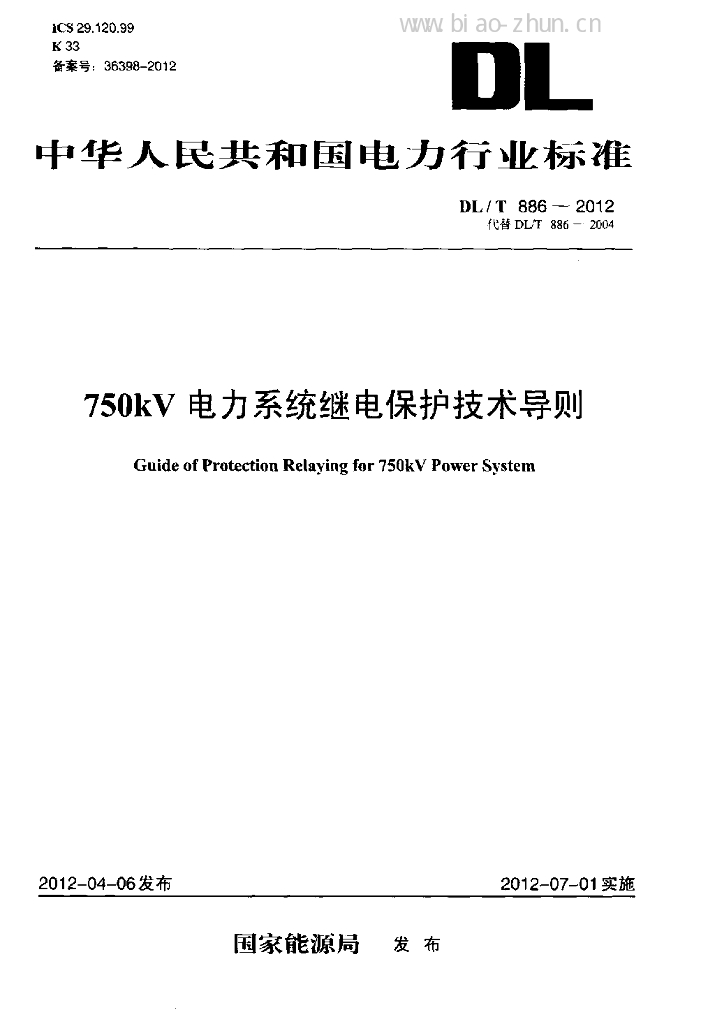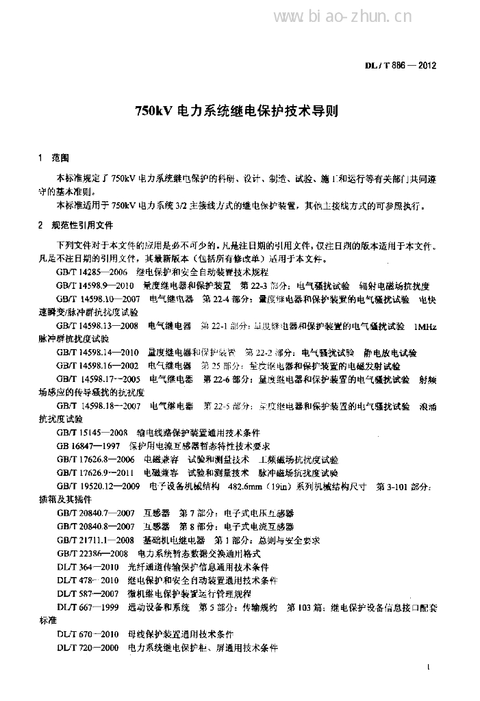 DL/T 886-2012 750kV电力系统继电保护技术导则