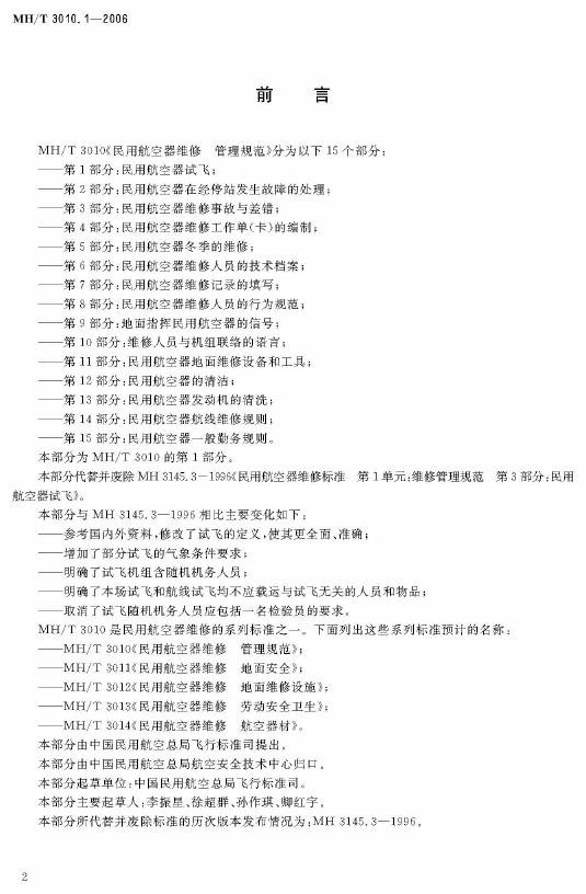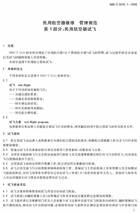 MH/T 3010.1-2006 民用航空器维修 管理规范 第1部分:民用航空器试飞