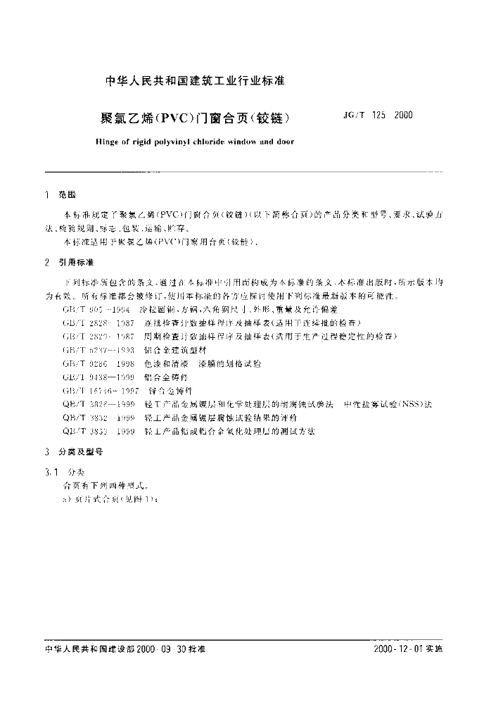 JG/T 125-2000 聚氯乙烯(PVC)门窗合页(铰链)