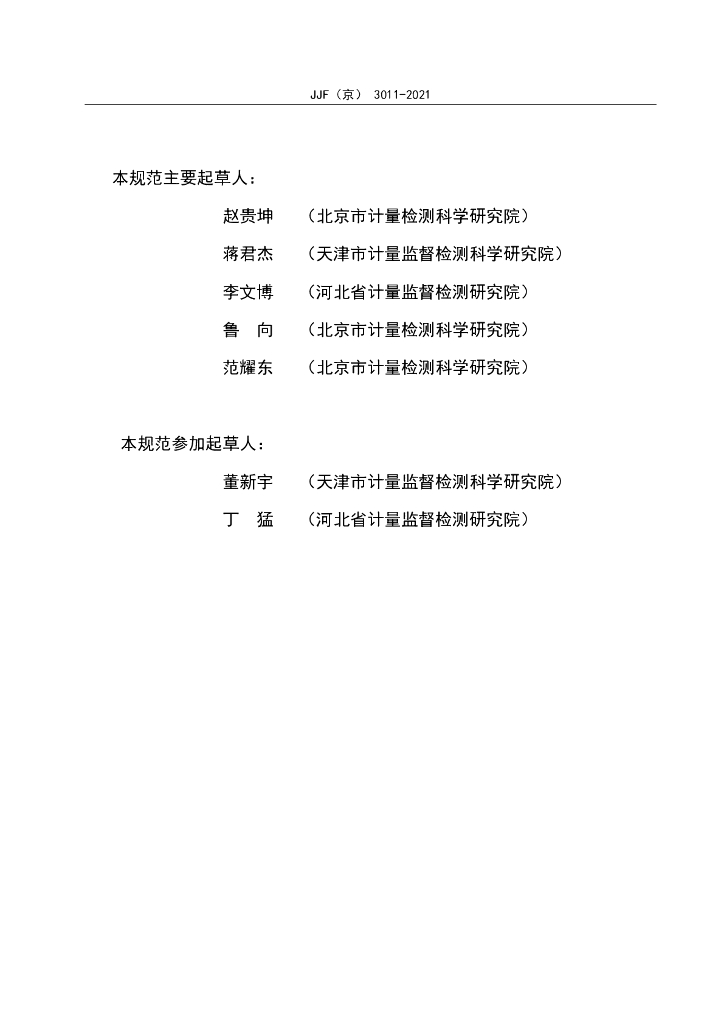 赵贵坤(北京市计量检测科学研究院)、蒋君杰(天津市计量监督检测科学研究院)、李文博(河北省计量监督检测研究院)、鲁向(北京市计量检测科学研究院)、范耀东(北京市计量检测科学研究院)、董新宇(天津市计量监督检测科学研究院)、丁猛(河北省计量监督检测研究院)