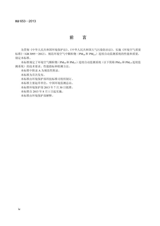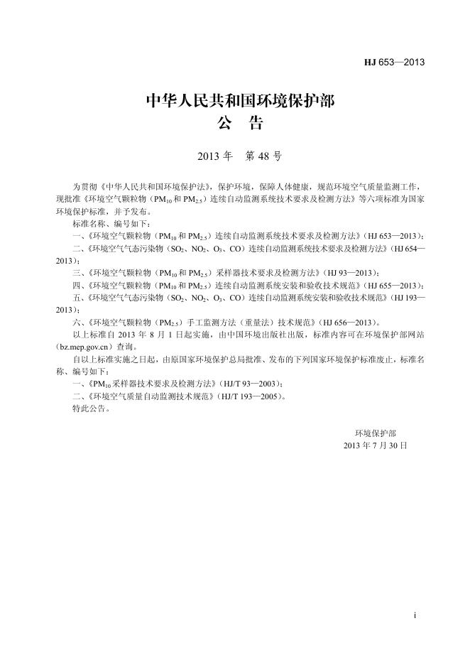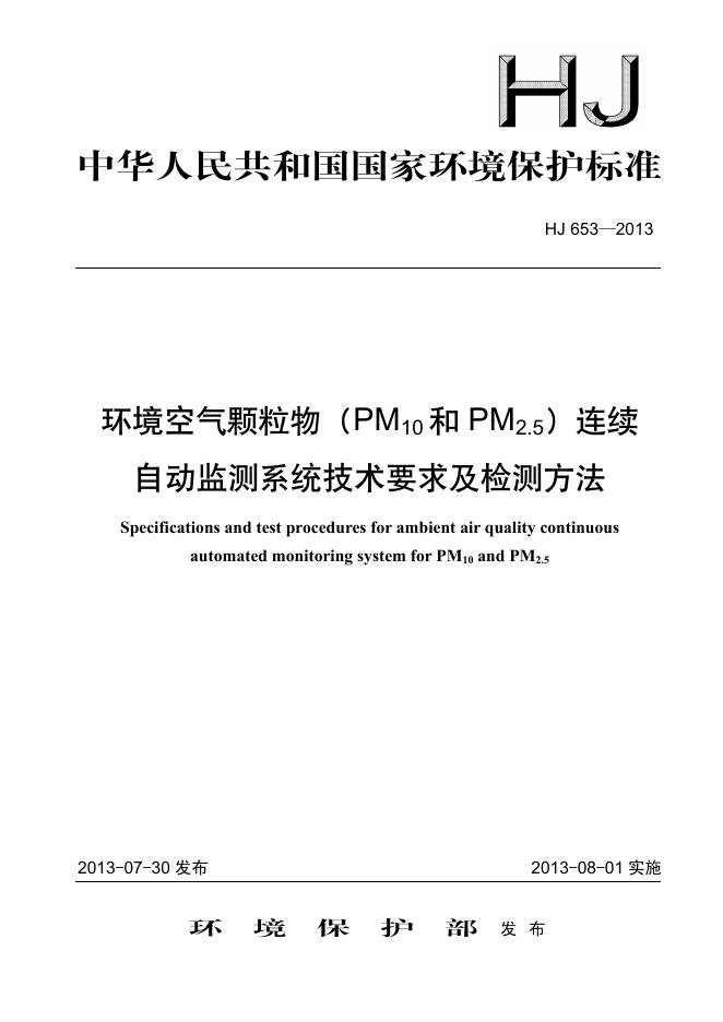 HJ 653-2013 环境空气颗粒物(PM10和PM2.5)连续自动监测系统技术要求及检测方法