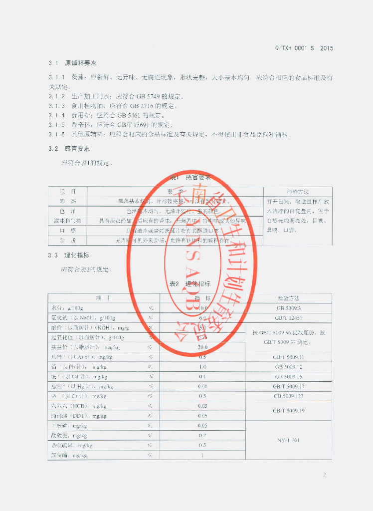 Q/TXH 0001S-2015 通海县小回村香片食品有限公司 茨菰片