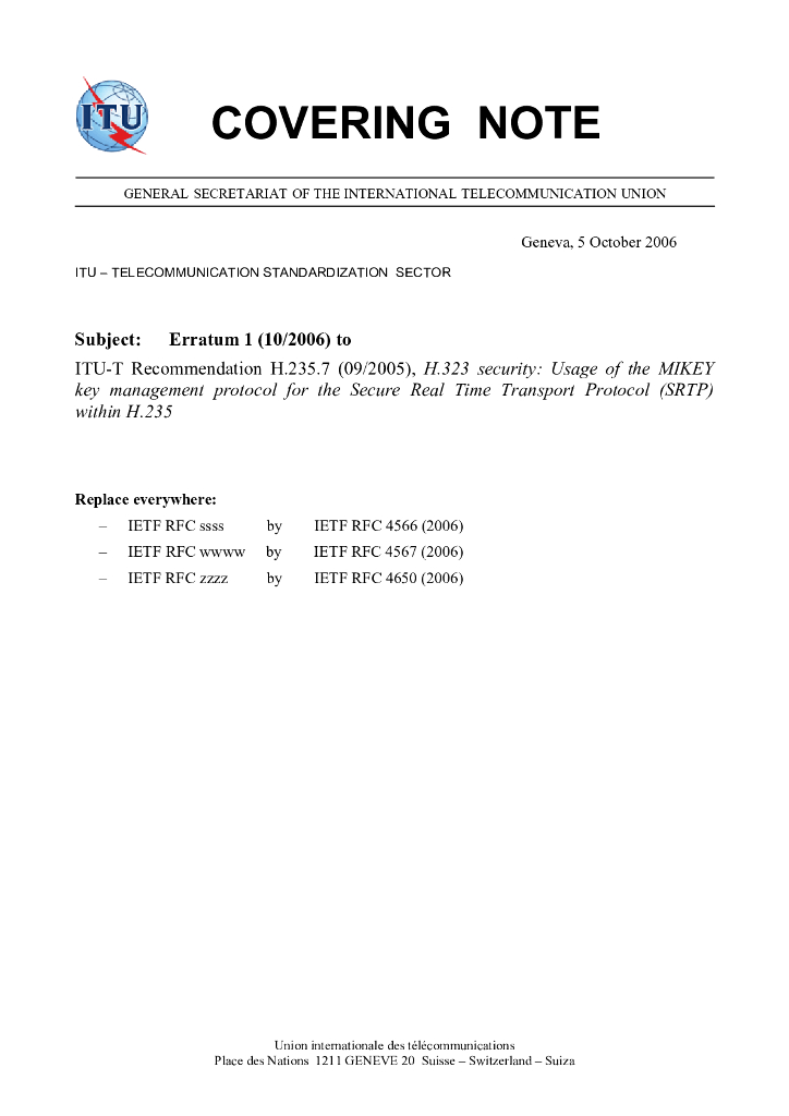 ITU-T H.235.7-2005/Erratum 1-2006 H.323安全:在H.235中使用MIKEY密钥管理协议用于安全实时传输协议(SRTP)
