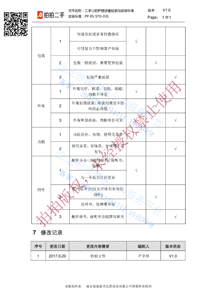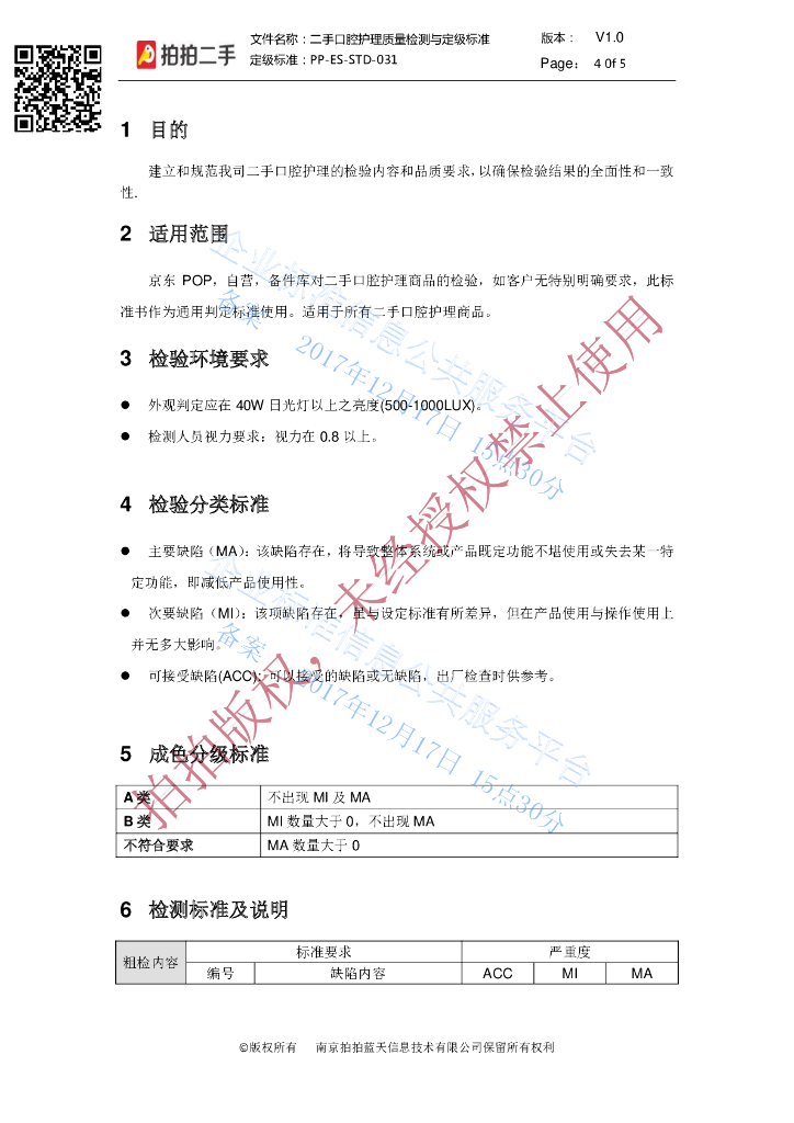 Q/PPESSTD 031-2017 二手口腔护理质量检测与定级标准
