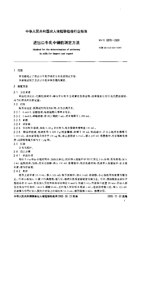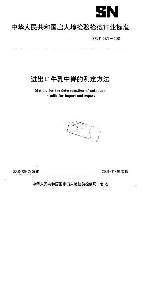 SN/T 0870-2000 进出口牛乳中锑的测定方法