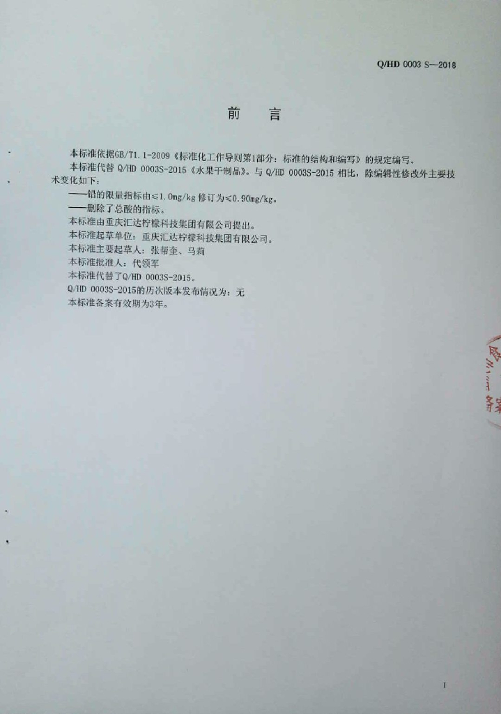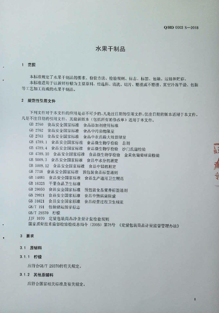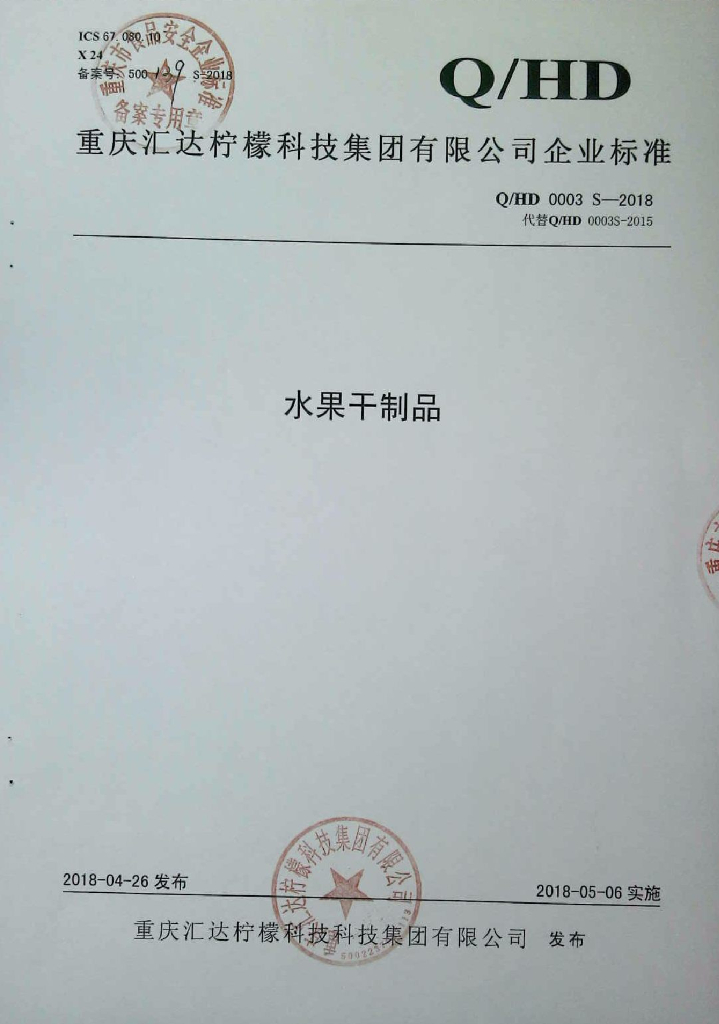 Q/HD 0003S-2018 水果干制品
