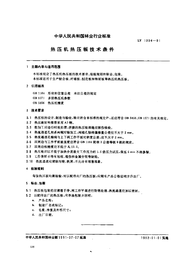 LY 1004-1991 热压机热压板技术条件