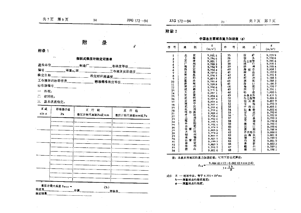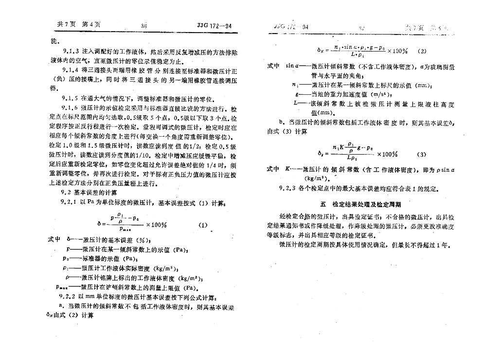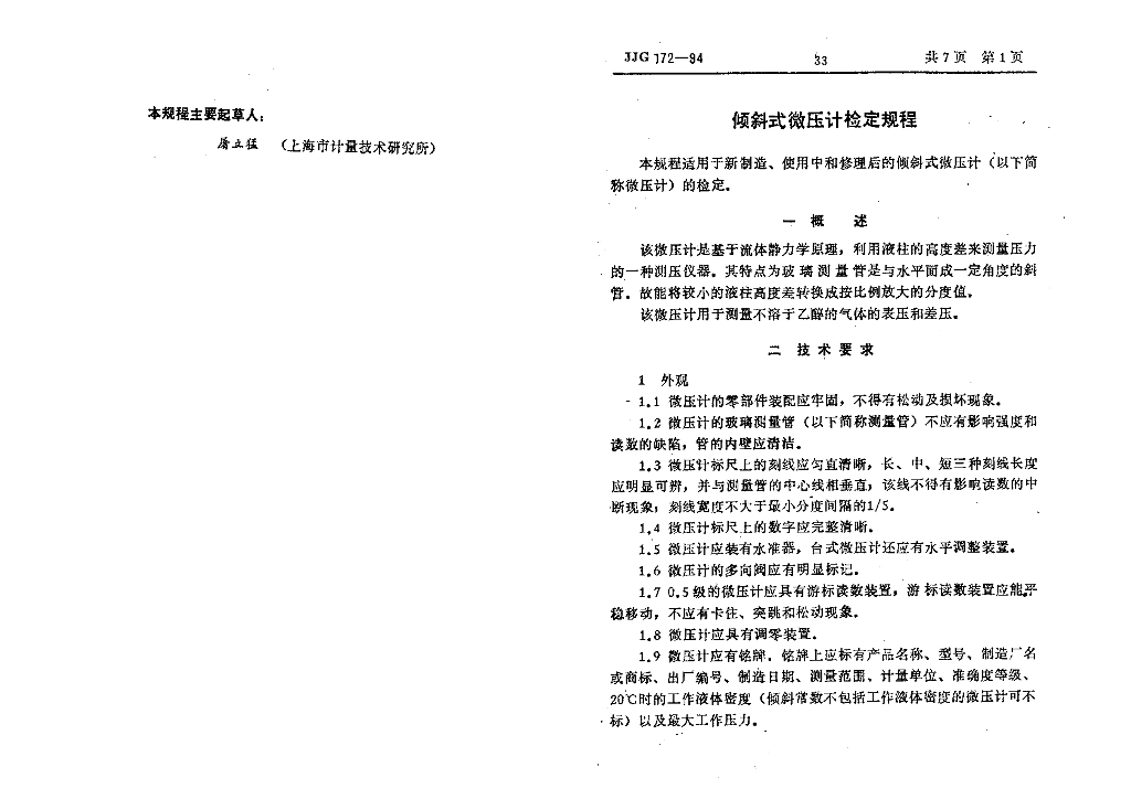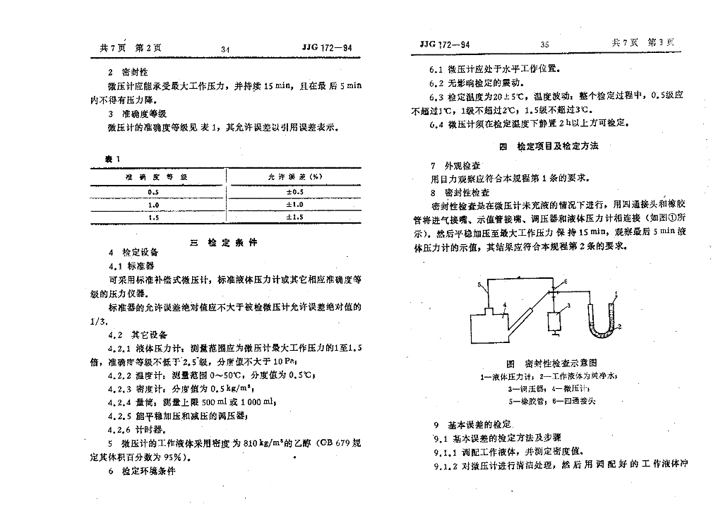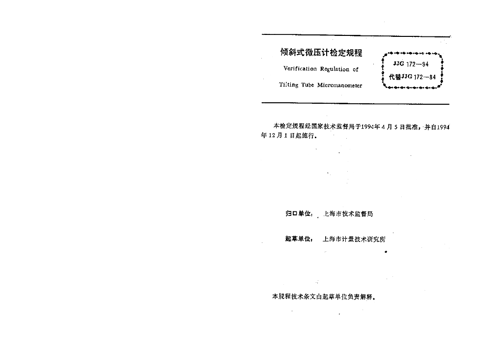 JJG 172-1994 倾斜式微压计检定规程