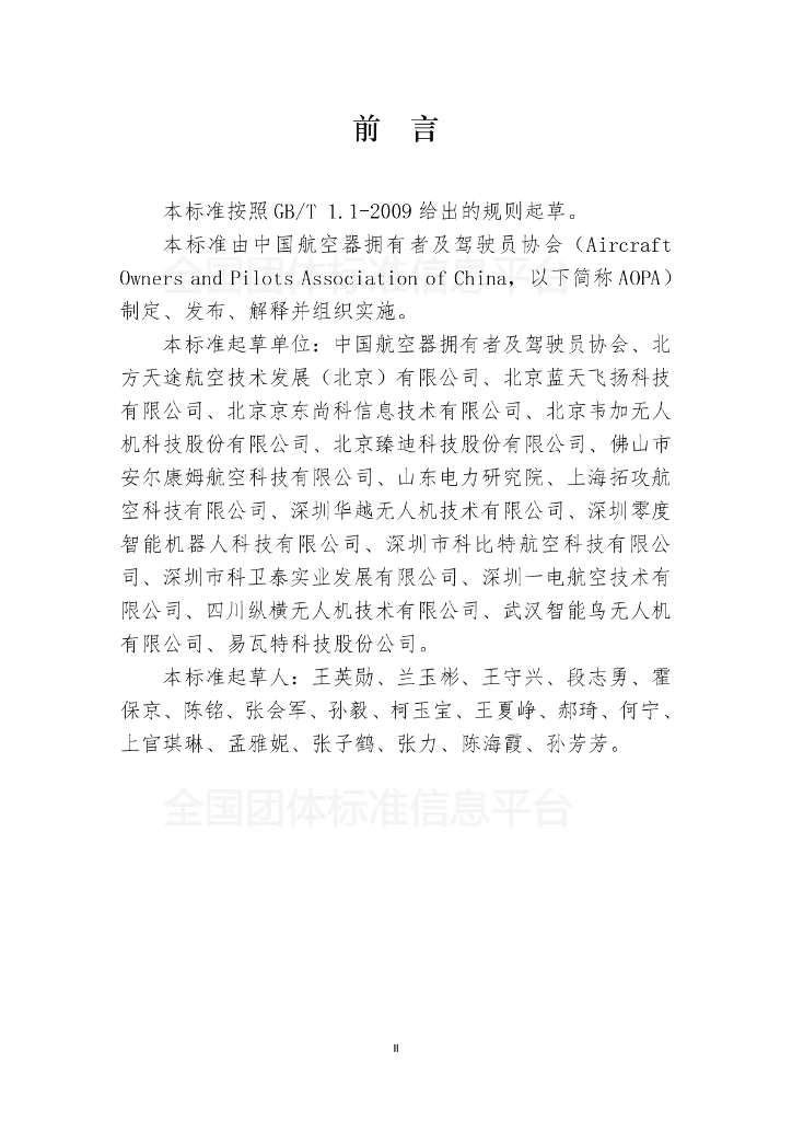 中国航空器拥有者及驾驶员协会、北方天途航空技术发展(北京)有限公司、北京蓝天飞扬科技有限公司、北京京东尚科信息技术有限公司、北京韦加无人机科技股份有限公司、北京臻迪科技股份有限公司、佛山市安尔康姆航空科技有限公司、山东电力研究院、上海拓攻航空科技有限公司、深圳华越无人机技术有限公司、深圳零度智能机器人科技有限公司、深圳市科比特航空科技有限公司、深圳市科卫泰实业发展有限公司、深圳一电航空技术有限公司、四川纵横无人机技术有限公司、武汉智能鸟无人机有限公司、易瓦特科技股份公司