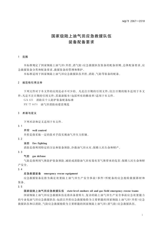 AQ/T 2067-2018 国家级陆上油气田应急救援队伍装备配备要求