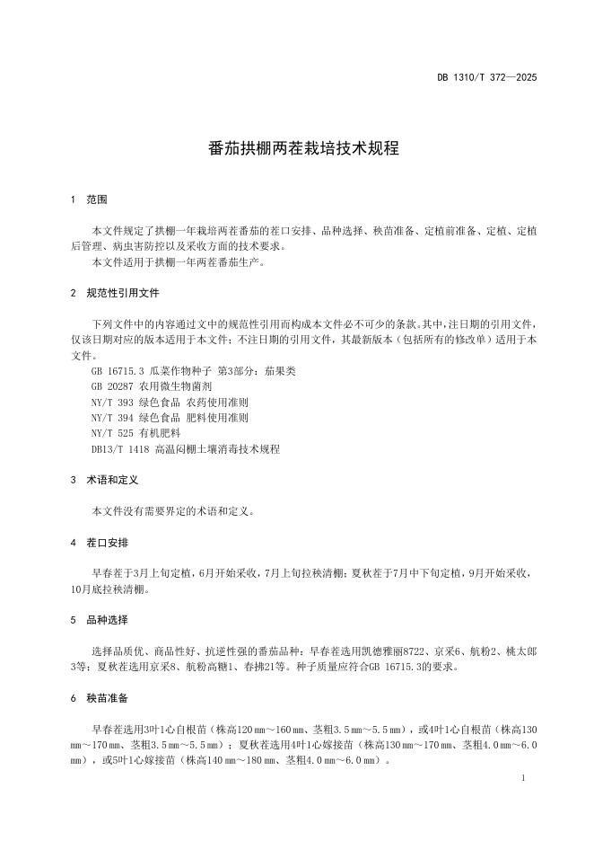 DB1310/T 372-2025 番茄拱棚两茬栽培技术规程