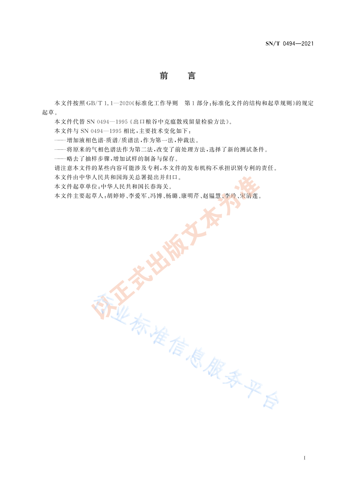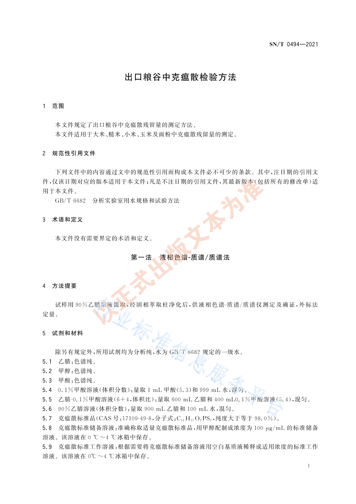 SN/T 0494-2021 出口粮谷中克瘟散检验方法