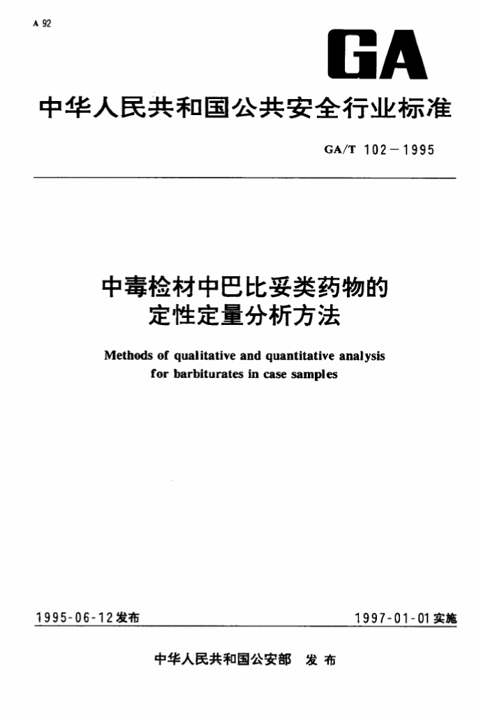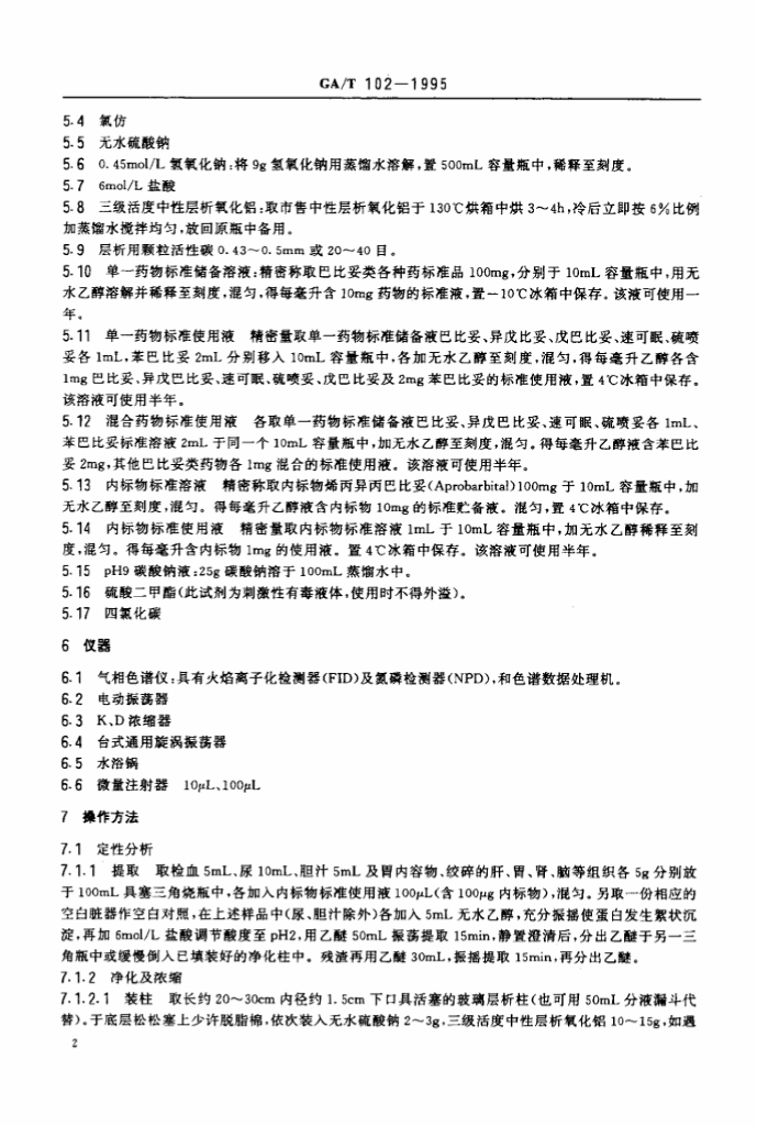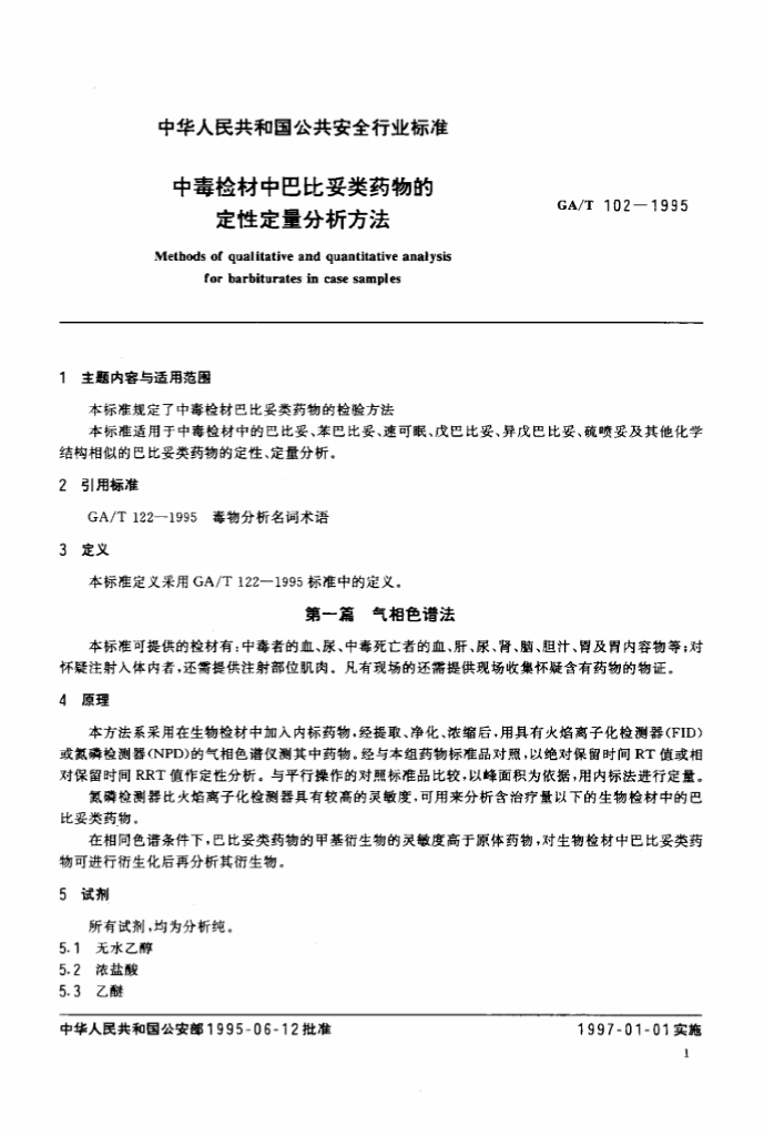 GA/T 102-1995 中毒检材中巴比妥类药物的定性定量分析方法