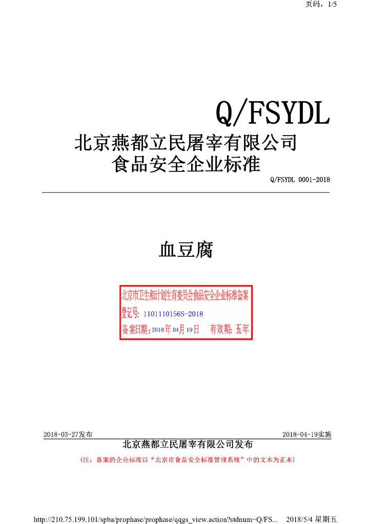 Q/FSYDL 0001-2018 北京燕都立民屠宰有限公司 血豆腐