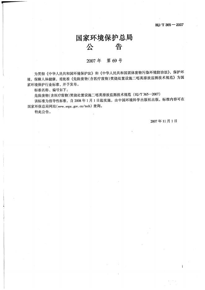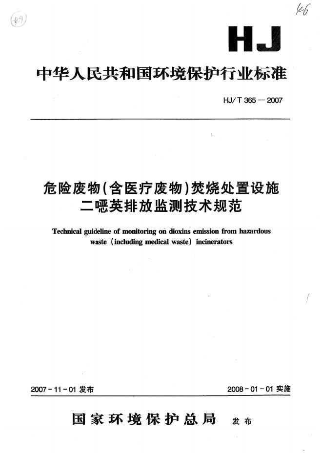 HJ/T 365-2007 危险废物(含医疗废物)焚烧处置设施二噁英排放监测技术规范