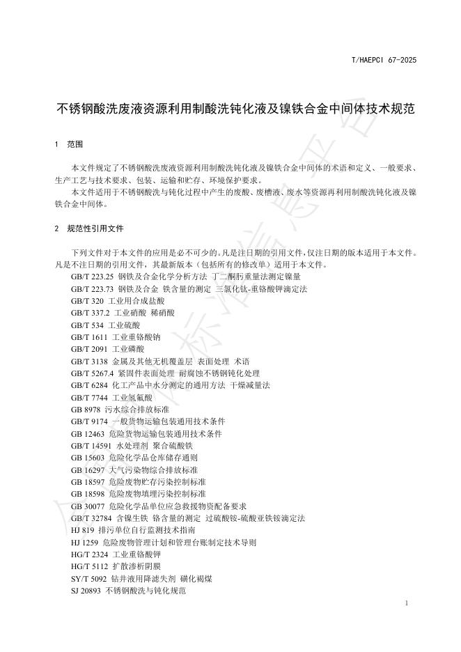 T/HAEPCI 67-2025 不锈钢酸洗废液资源利用制酸洗钝化液及镍铁合金中间体技术规范
