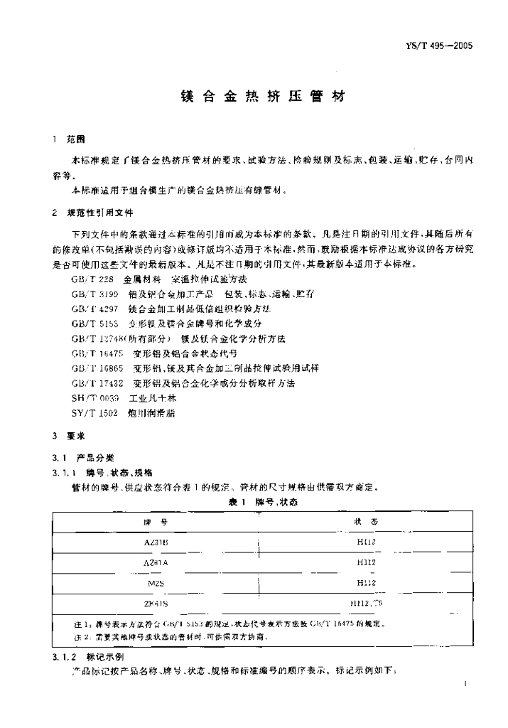 YS/T 495-2005 镁合金热挤压管材
