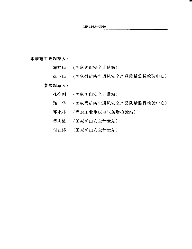 陈福民(国家矿山安全计量站)、徐三民(国家煤矿防尘通风安全产品质量监督检验中心)、孔令刚(国家矿山安全计量站)、郑华(国家煤矿防尘通风安全产品质量监督检验中心)、邓永林(煤炭工业重庆电气防爆检验站)、曹利波(国家矿山安全计量站)、付建涛(国家矿山安全计量站)