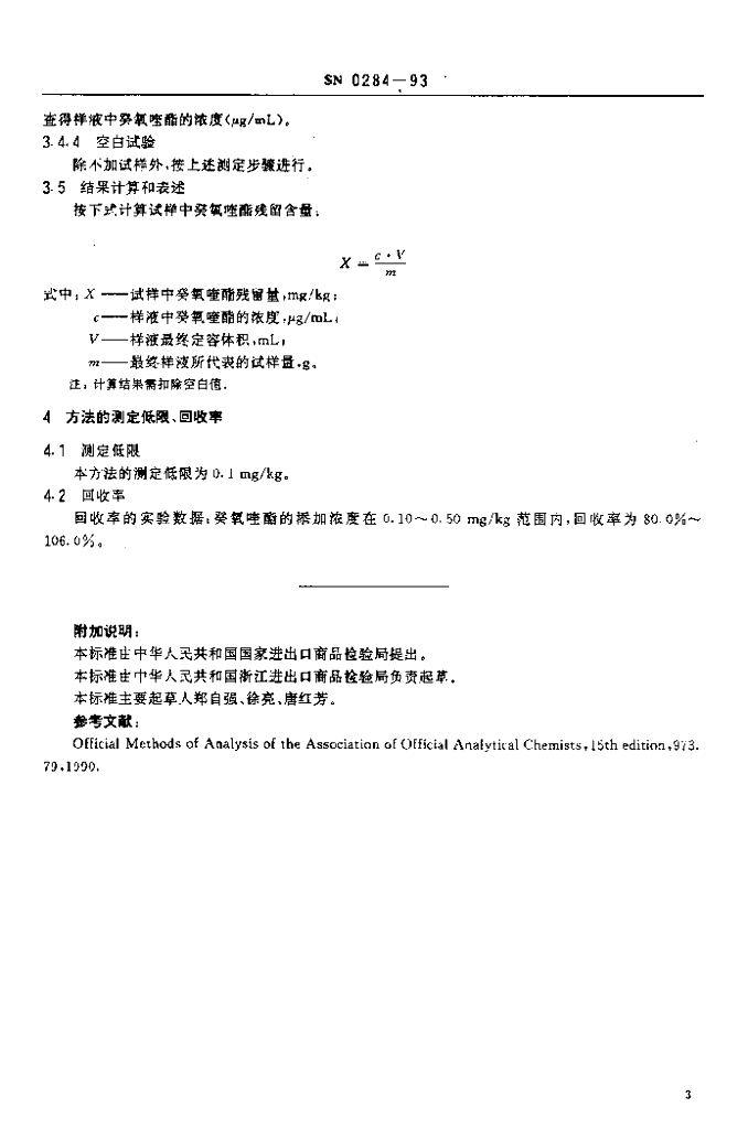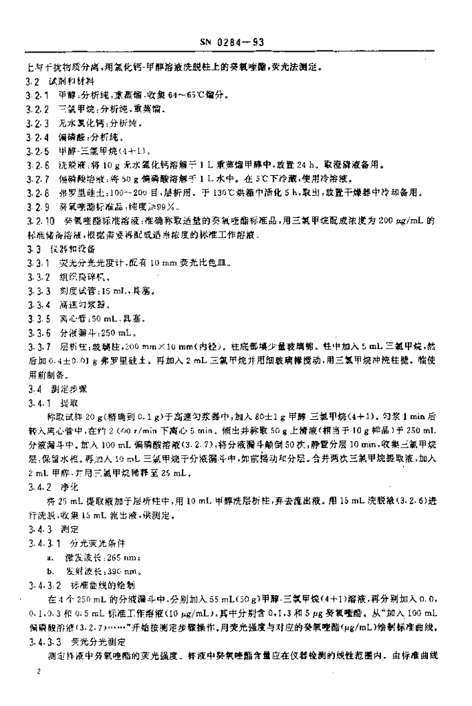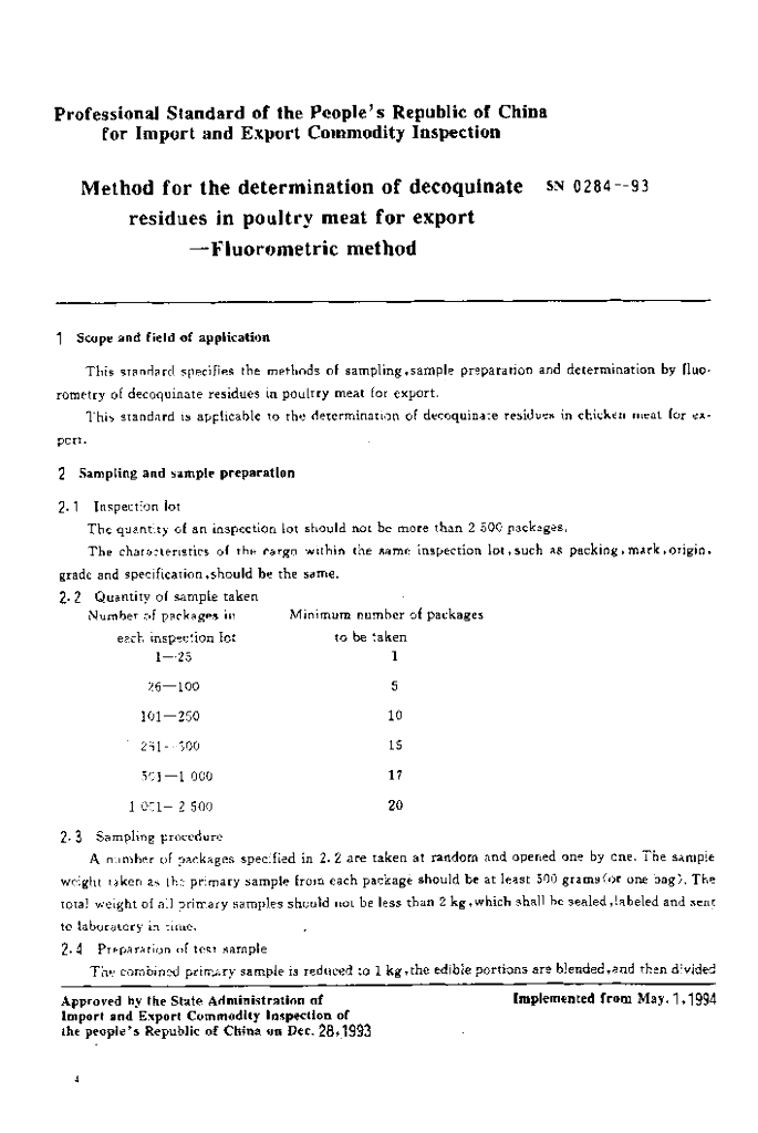 SN 0284-1993 出口禽肉中癸氧喹酯残留量检验方法荧光法