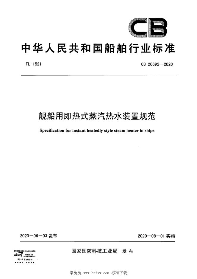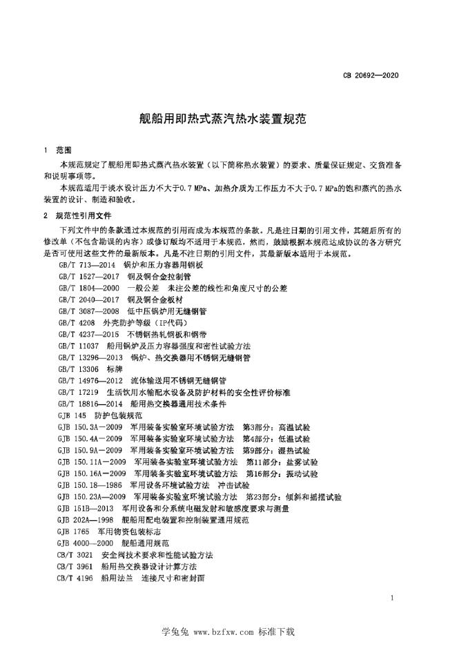 CB 20692-2020 舰船用即热式蒸汽热水装置规范