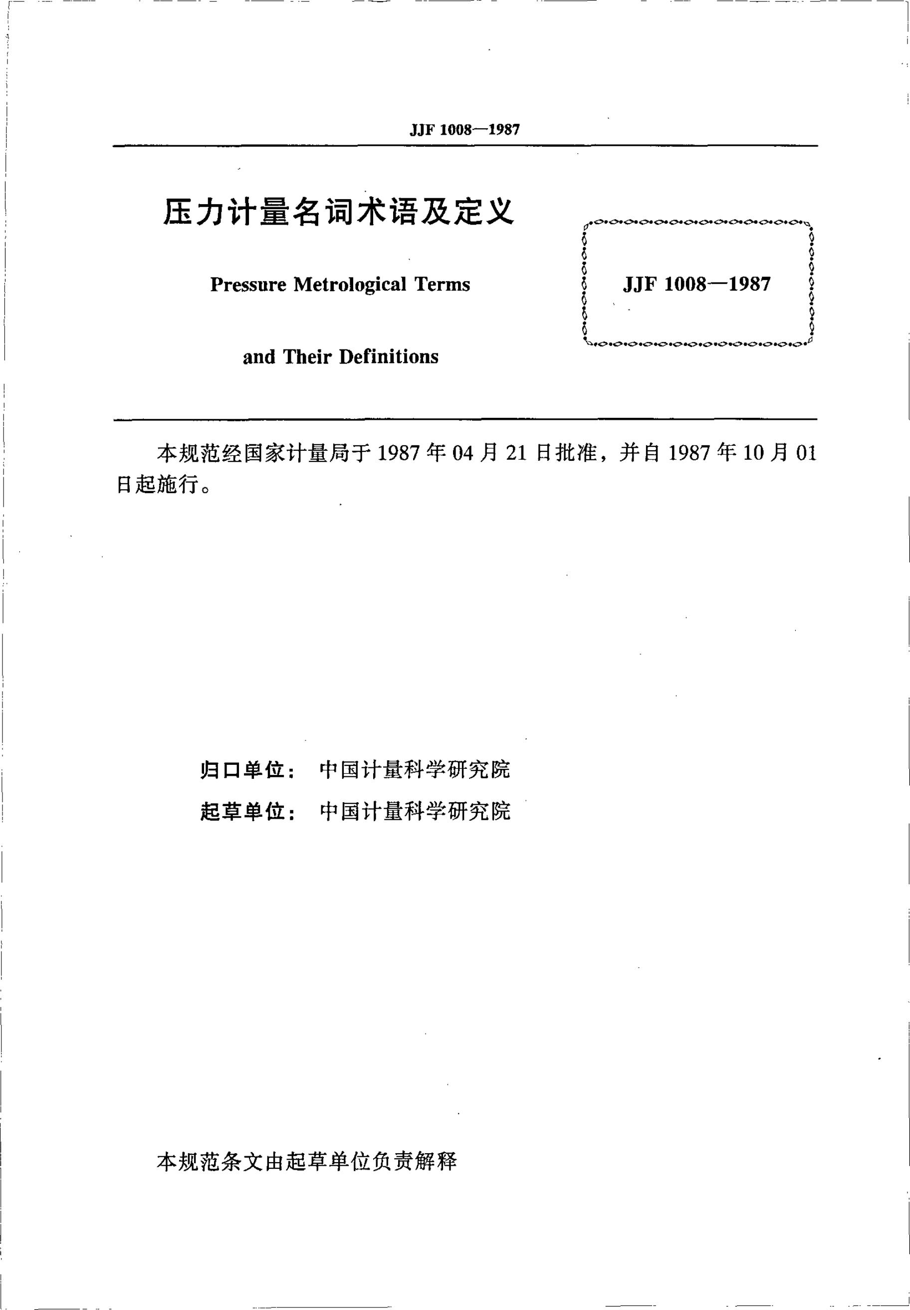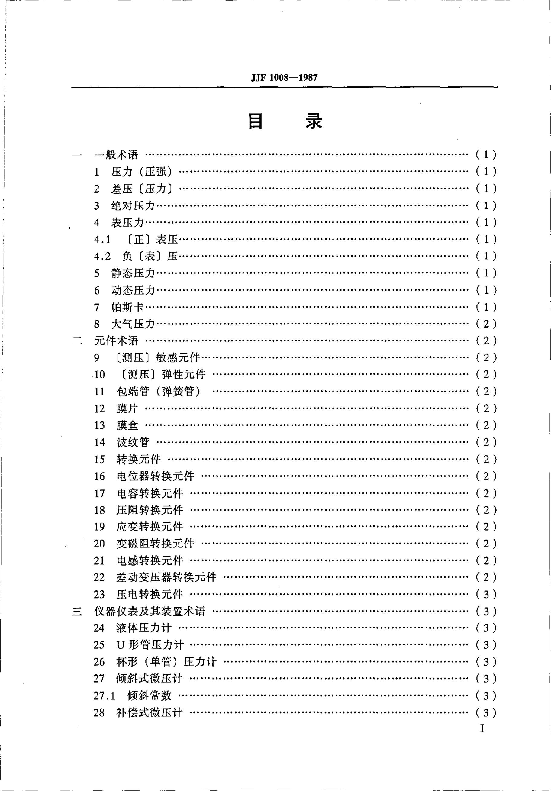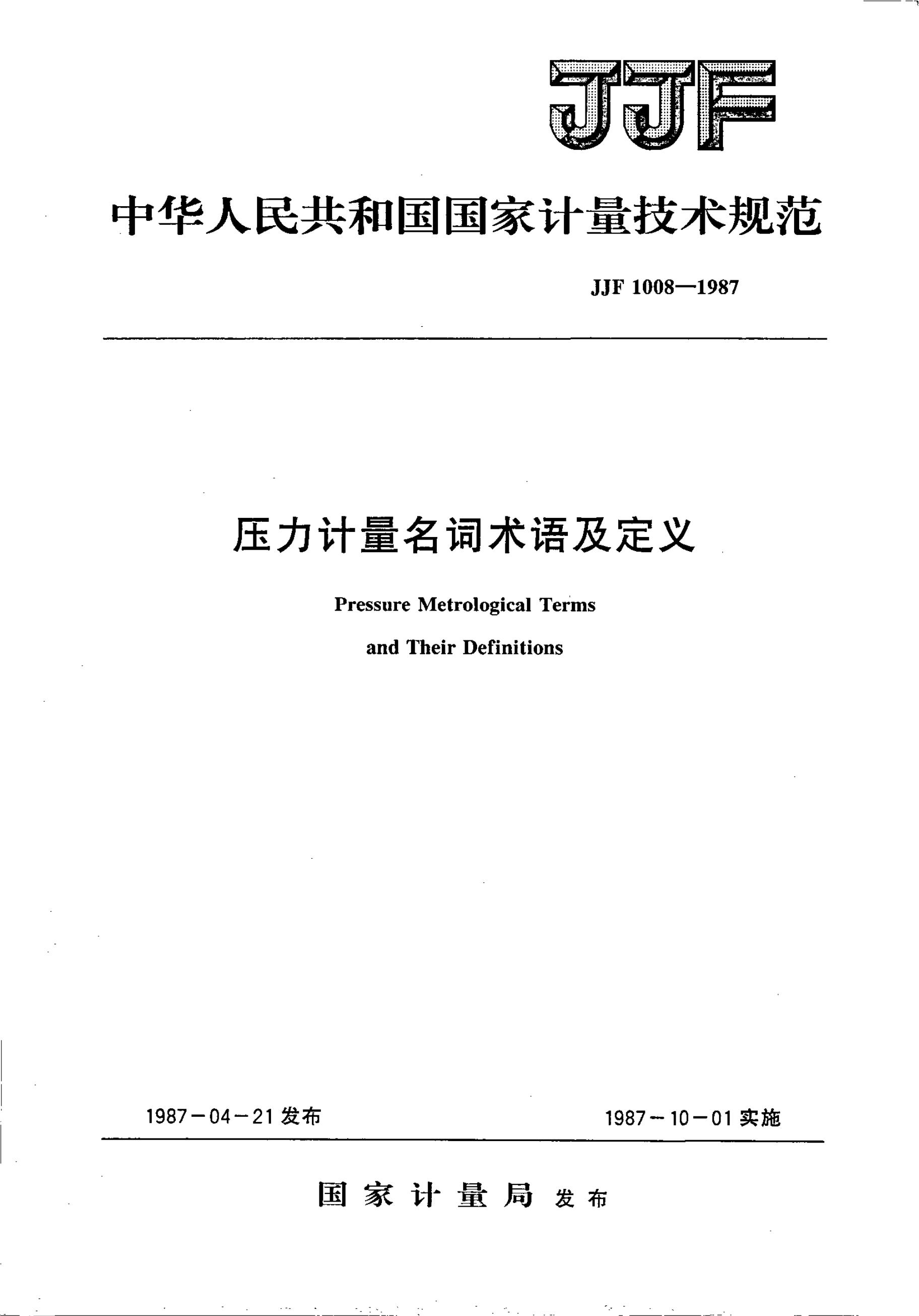 JJF 1008-1987 压力计量名词术语及定义