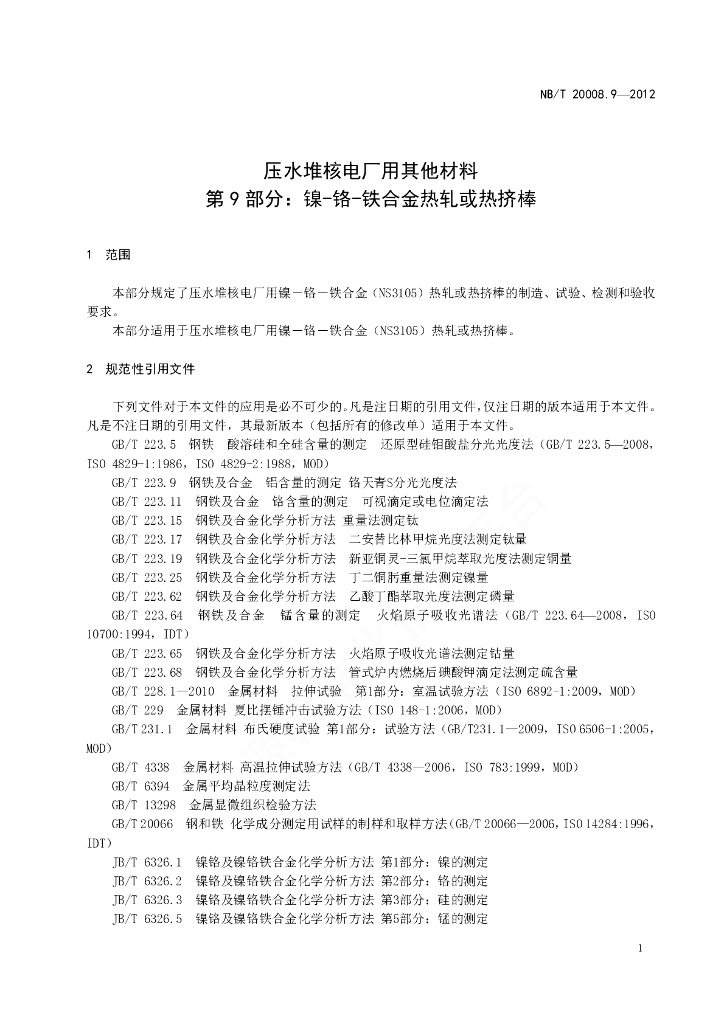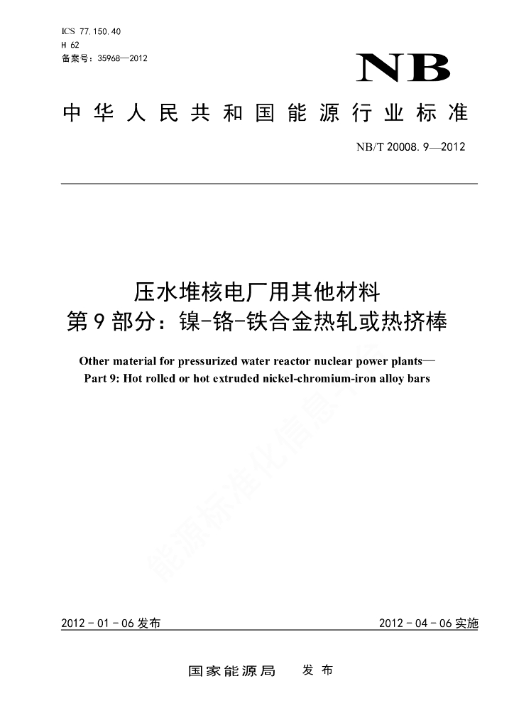 NB/T 20008.9-2012 压水堆核电厂用其他材料 第9部分:镍-铬-铁合金热轧或热挤棒