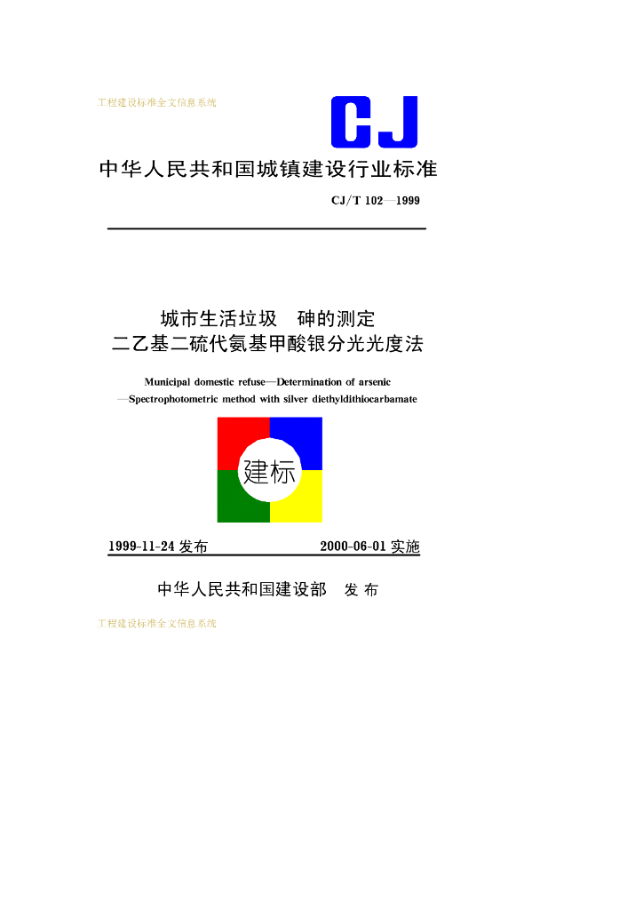 CJ/T 102-1999 城市生活垃圾 砷的测定 二乙基二硫代氨基甲酸银分光光度法