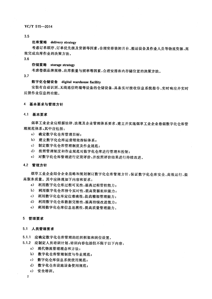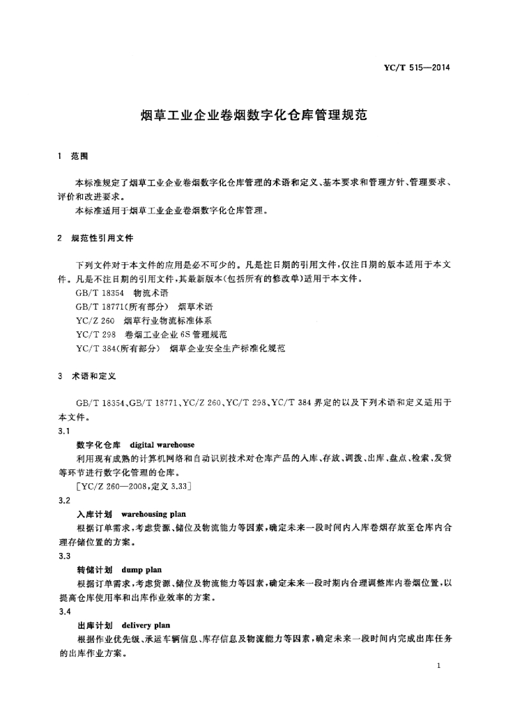 YC/T 515-2014 烟草工业企业卷烟数字化仓库管理规范